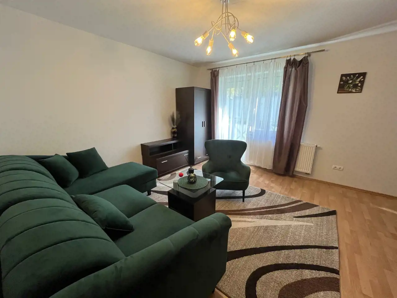 - Słoneczny salon z wyjściem na balkon.