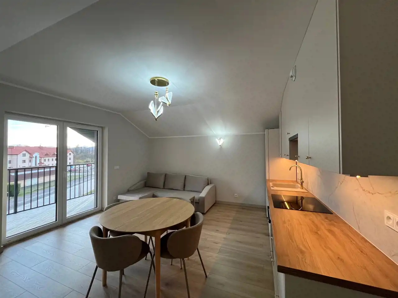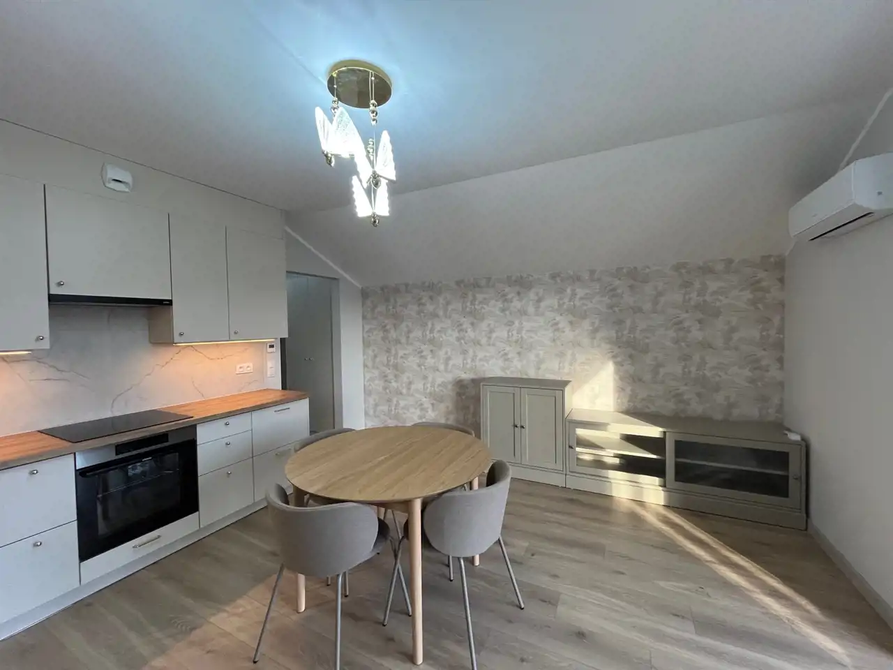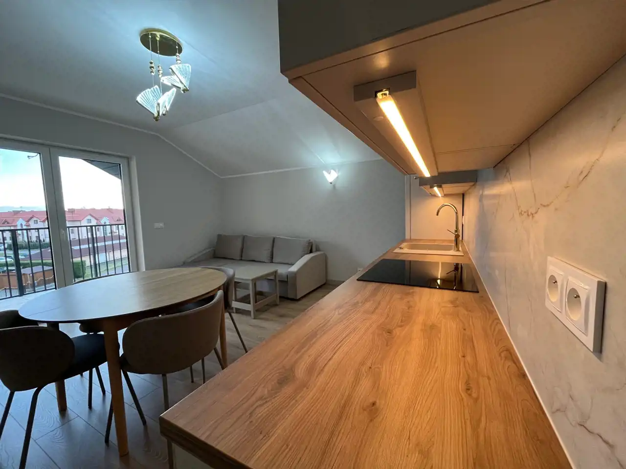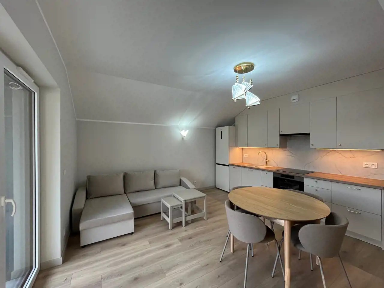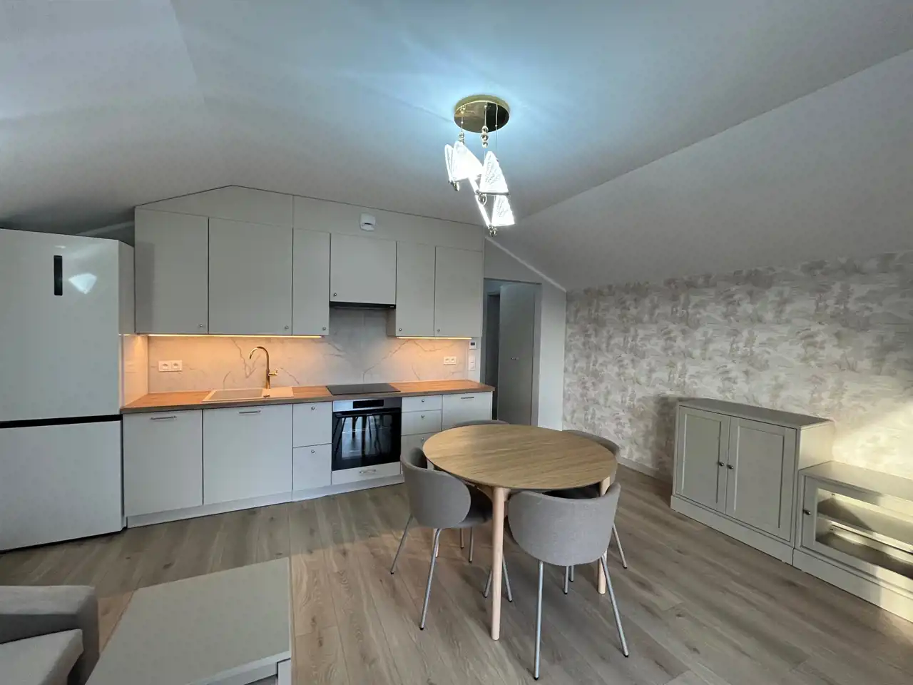 Jasny salon z nowoczesnym aneksem kuchennym,