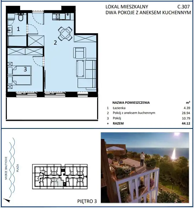 - Charakterystyka mieszkania 44.12 m2, 2 pokoje