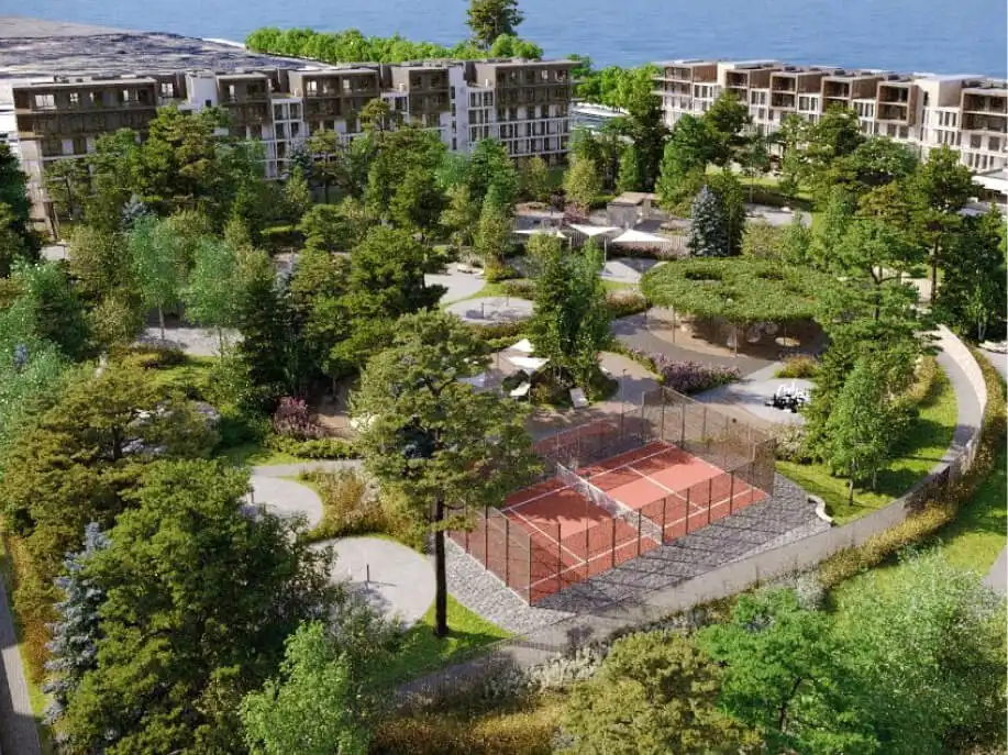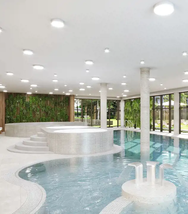 Na terenie kompleksu przewidziane zostały restauracje, baseny zewnętrze, strefa dla dzieci oraz spa z basenami wewnętrznymi - dzięki czemu z przyjemnością spędzisz tu cały rok.