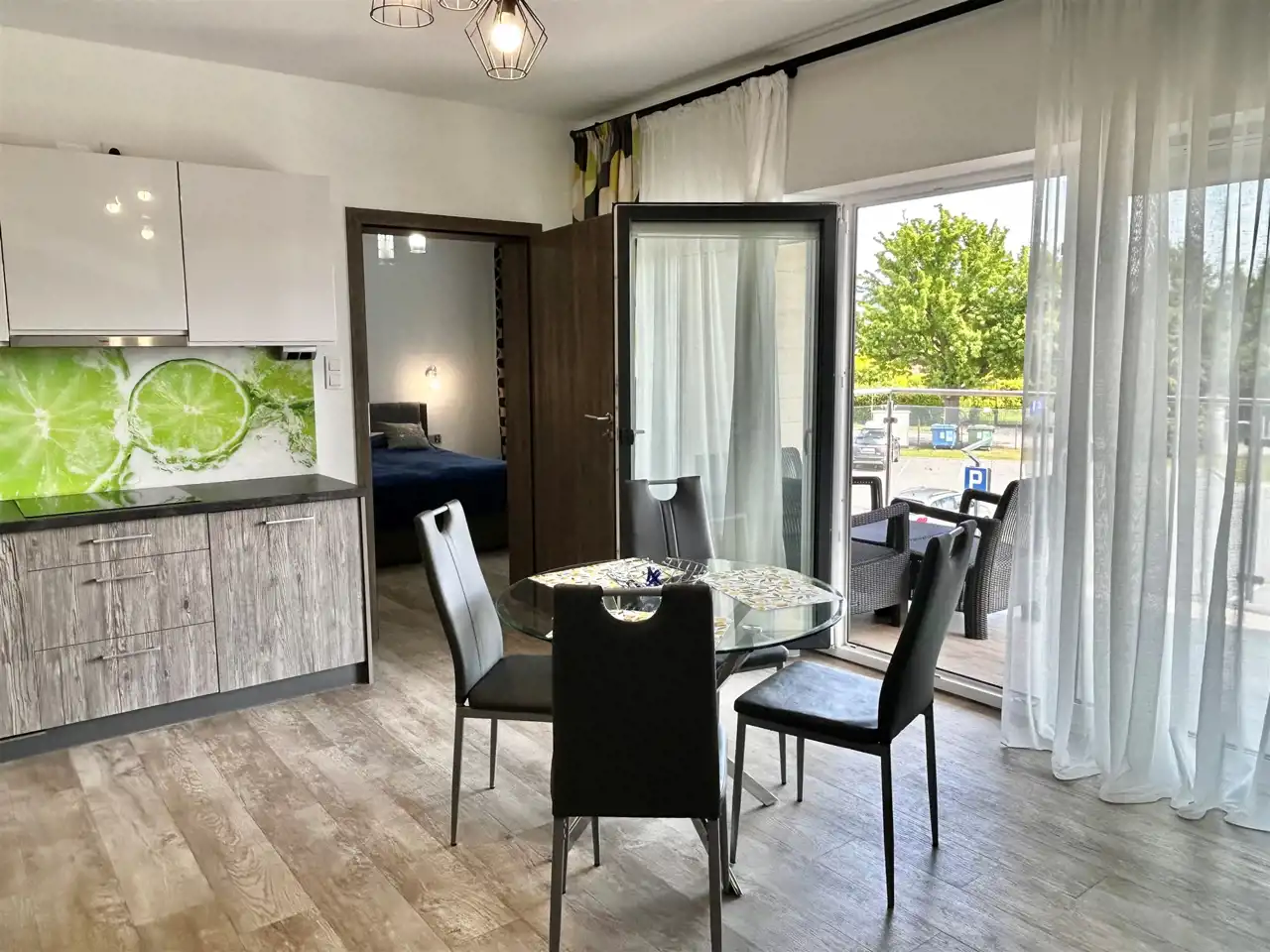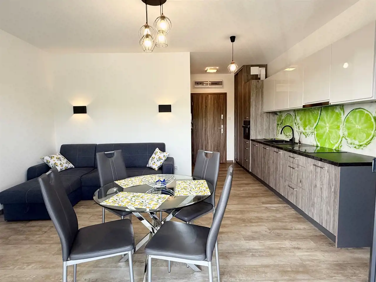 - jasnego salonu z aneksem kuchennym w układzie otwartym,