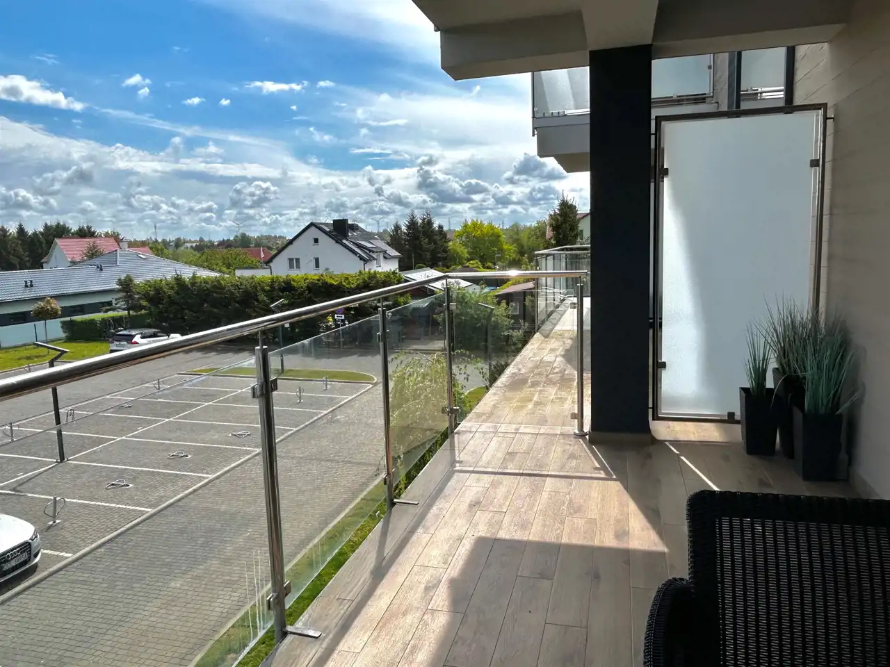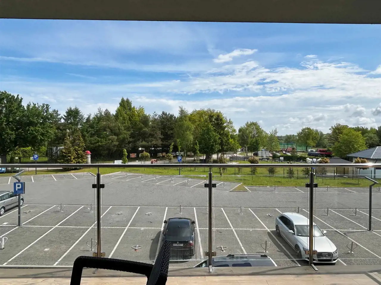 - dużego balkonu z ekspozycją wschodnią i widokiem na park oraz parking.