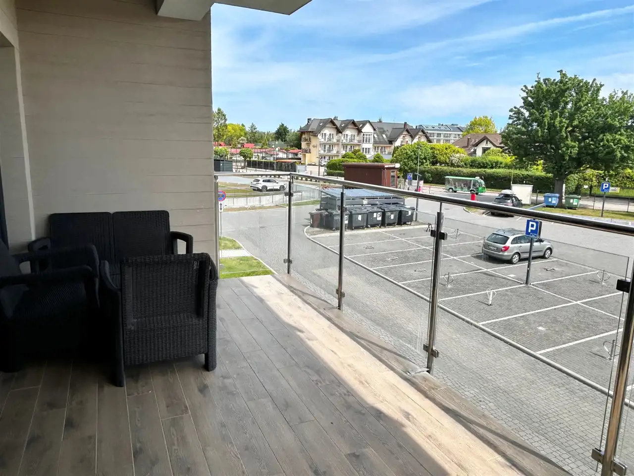 - dużego balkonu z ekspozycją wschodnią i widokiem na park oraz parking.