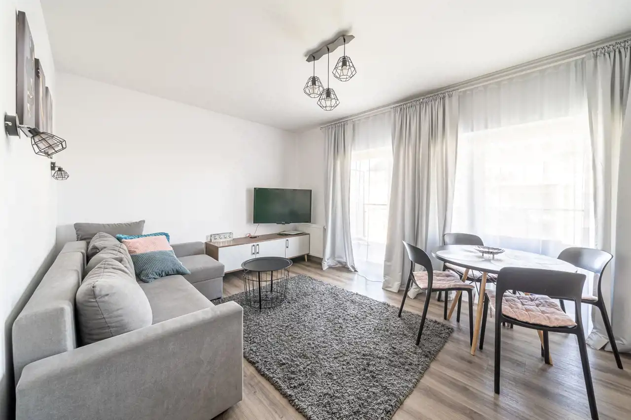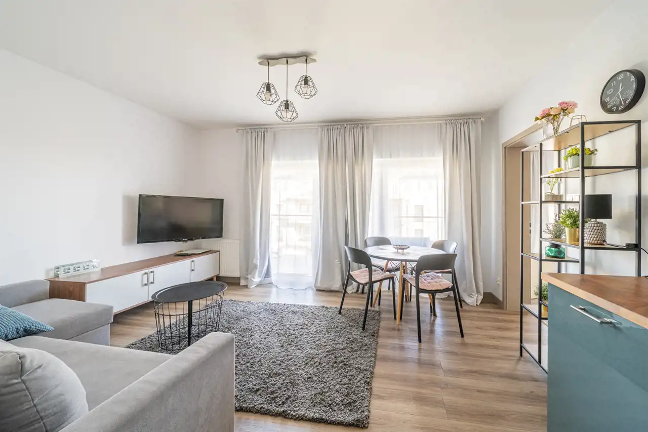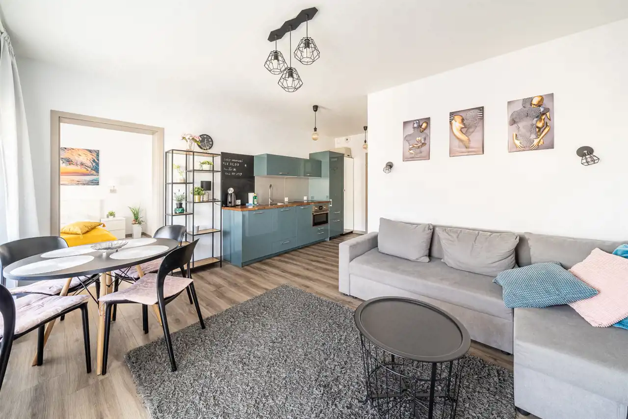 - Salon z aneksem kuchennym – jasna, otwarta przestrzeń idealna do wypoczynku i wspólnych chwil