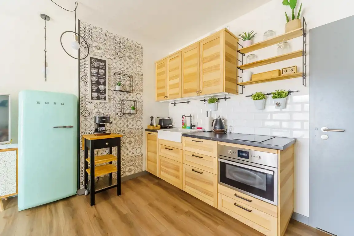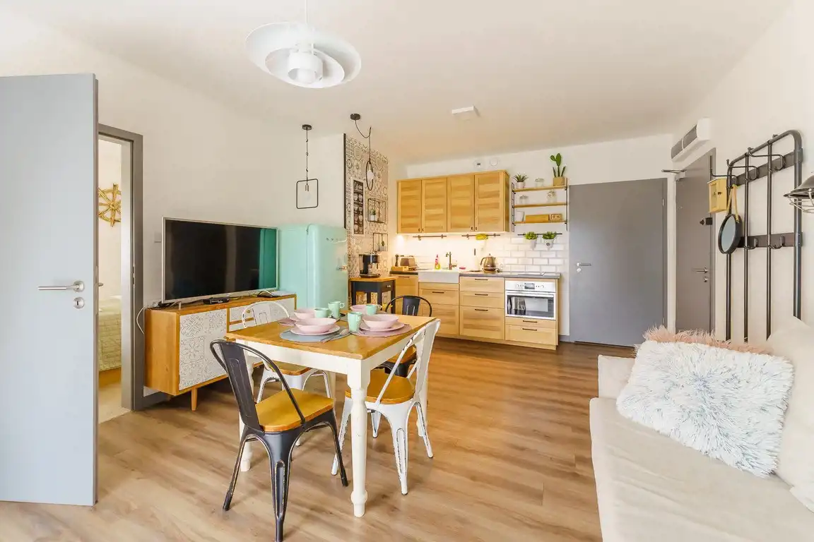 Wykończenie w wysokim standardzie. Na podłogach panele i terakota, wypłytkowana łazienka. Aneks kuchenny wraz ze sprzętem AGD: chłodziarko-zamrażarka, płyta elektryczna, piekarnik z mikrofalą, zmywarka i pochłaniacz z wywiewem. Łazienka ze szklaną kabiną prysznicową oraz umywalką z szafką. Sypialnia z podwójnym łóżkiem wraz ze stolikami nocnymi. Drzwi wejściowe antywłamaniowe. Luksusowe wyposażenie idealnie łączy się z funkcjonalnością pomieszczeń.