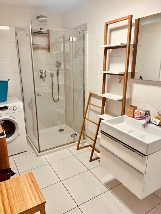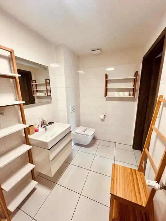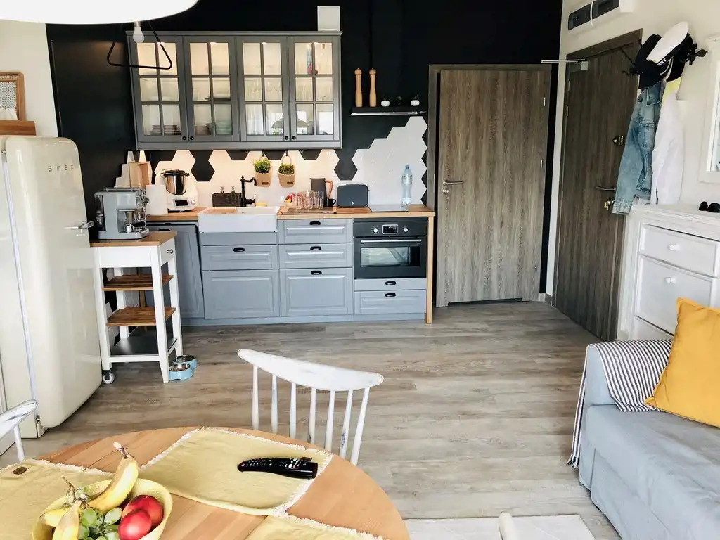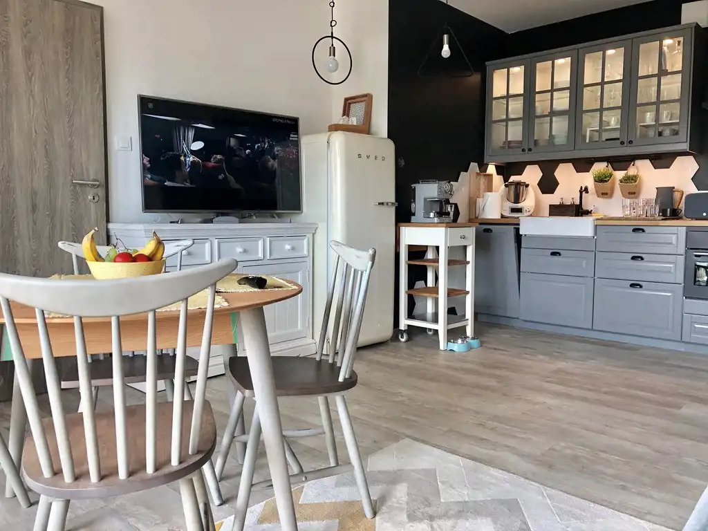 Wykończenie w wysokim standardzie. Na podłogach panele i terakota, wypłytkowana łazienka. Aneks kuchenny wraz ze sprzętem AGD: chłodziarko-zamrażarka, płyta indukcyjna, piekarnik z mikrofalą, zmywarka i pochłaniacz z wywiewem. Łazienka ze szklaną kabiną prysznicową oraz umywalką z szafką (do dyspozycji nowa pralka Electrolux). Sypialnia z podwójnym łóżkiem wraz ze stolikami nocnymi. Drzwi wejściowe antywłamaniowe.