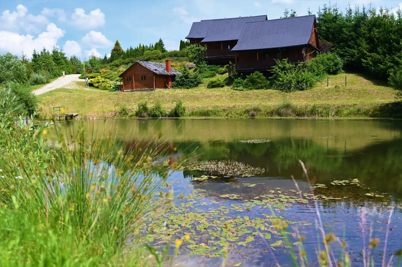 Własny staw rekreacyjno- wędkarski, letnie baseny o pow. łącznej ok. 60 m2, plac zabaw dla dzieci, stoliki, parasole, leżaki, pergole z ławeczkami, zagajnik brzozowy, widokowy nad przepływającym potokiem, ławki, mostek, ścieżki spacerowe itp. umilają letni wypoczynek.