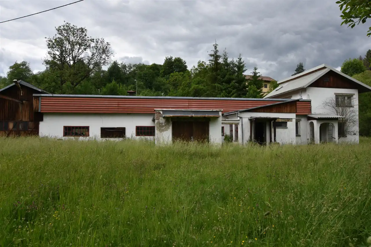 - budynek gospodarczy z częścią mieszkalną, wybudowany w latach 70-90tych był zakładem produkującym okleiny, (budynek sprzedawany z wyposażeniem) o pow. zabudowy ok 330m2. Budynek murowany, parterowy z 1 dużą halą produkcyjną z bramą wjazdową, dodatkowymi pomieszczeniem i garażem stanowiącym część budynku. Budynek nadający się do generalnego remontu. Cześć mieszkalna 2 kondygnacyjna, posiada osobne wejście. Do budynku doprowadzona jest linia energetyczna, woda z własnej studni oraz szambo.