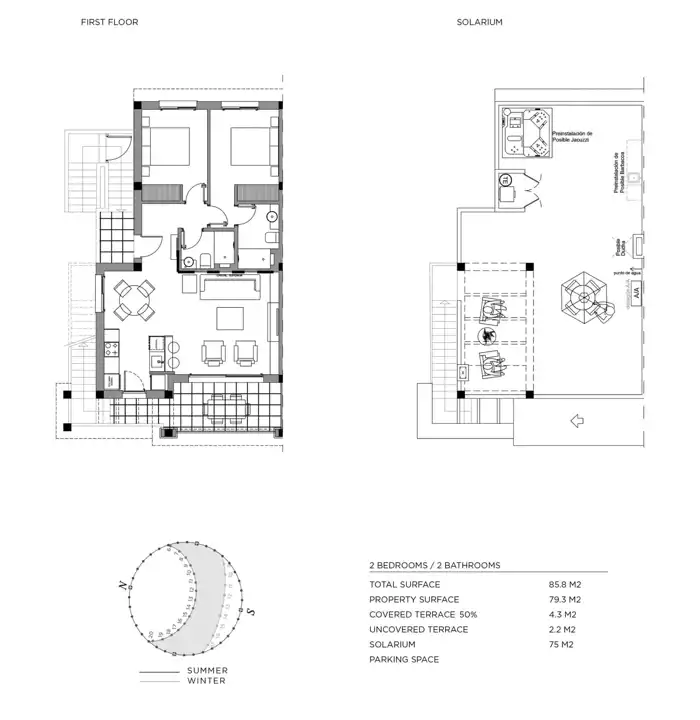 Apartamenty typu bungalow: dostępne w wersji z 2 lub 3 sypialniami, znajdujące się na dwóch poziomach – parter z prywatnym ogrodem lub pierwsze piętro z przestronnym tarasem na dachu.