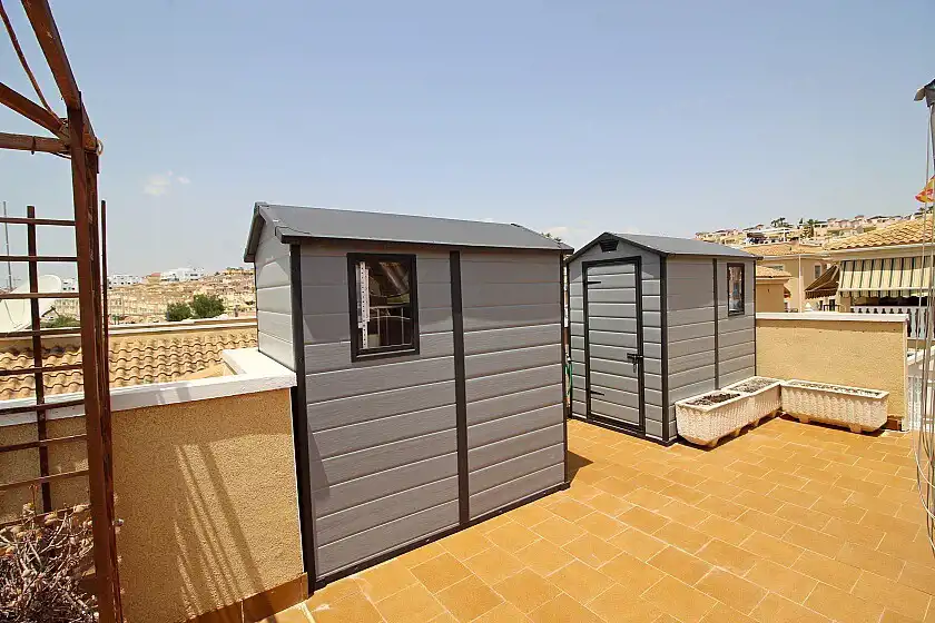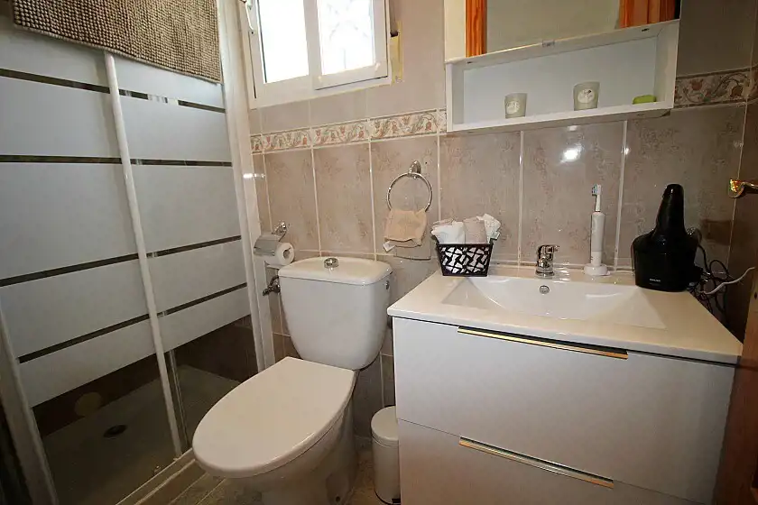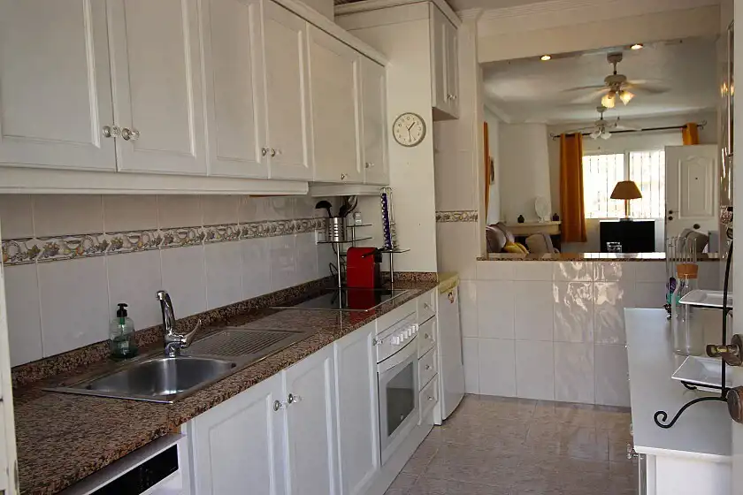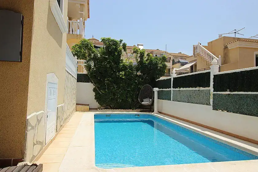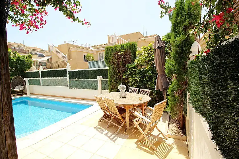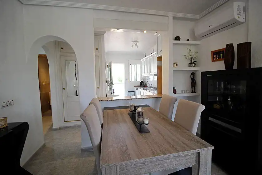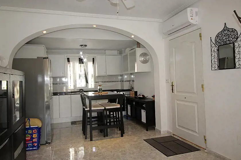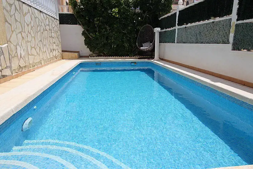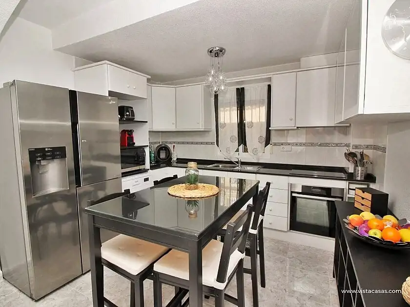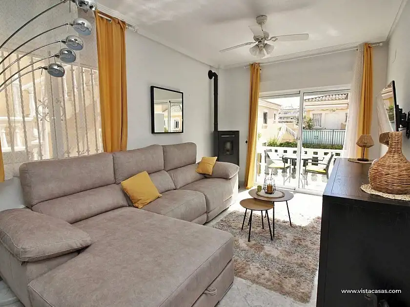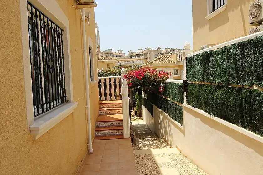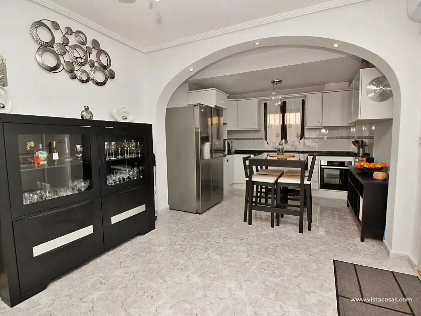 Wolnostojąca willa z 3 sypialniami w pobliżu Villamartín. Ten wychodzący na południe dom dysponuje dużym ogrodem, słonecznym solarium, prywatnym basenem, garażem oraz w pełni wyposażonym niezależnym aneksem. Dom główny składa się z jasnego salonu-jadalni z kominkiem, oddzielnej kuchni z wyjściem na tylny balkon z zewnętrznymi schodami do solarium, 2 sypialni z wbudowanymi szafami oraz rodzinnej łazienki. Jedna z sypialni w budynku głównym obejmuje łazienkę z prysznicem. W niezależnym aneksie znajduje się duża sypialnia, przestronny i jasny salon-jadalnia z piecem na pellet, otwarta kuchnia oraz łazienka z prysznicem. Ta przestrzeń oferuje duży potencjał, idealna dla dużej rodziny lub jako aneks dla gości lub pod wynajem. Dom znajduje się blisko terenów zielonych ze wspólnym basenem. Sprzedawane częściowo umeblowane iz ciepłą/zimną klimatyzacją. Położony mniej niż 15 minut spacerem od Plaza de Villamartín i kilku pól golfowych, a także wielu barów, restauracji i sklepów. Centrum handlowe Zenia Boulevard oraz plaże i zatoczki Orihuela Costa oddalone są o zaledwie 10 minut jazdy samochodem.