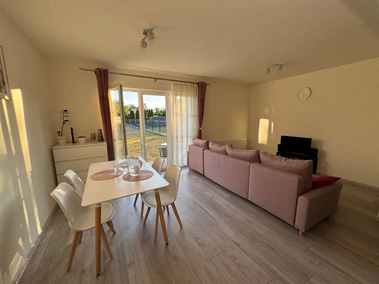 Z salonu wychodzimy na mały taras z kostki brukowej i pokaźniej wielkości ogródek o powierzchni ok. 185 m2.