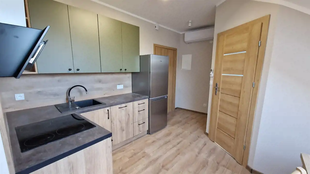 Mieszkanie jest wyposażone w niezbędne meble i sprzęt AGD. Kuchnia jest wykonana na wymiar ze wszystkimi sprzętami: piekarnik, płyta, lodówka, zmywarka.