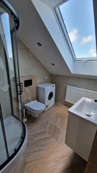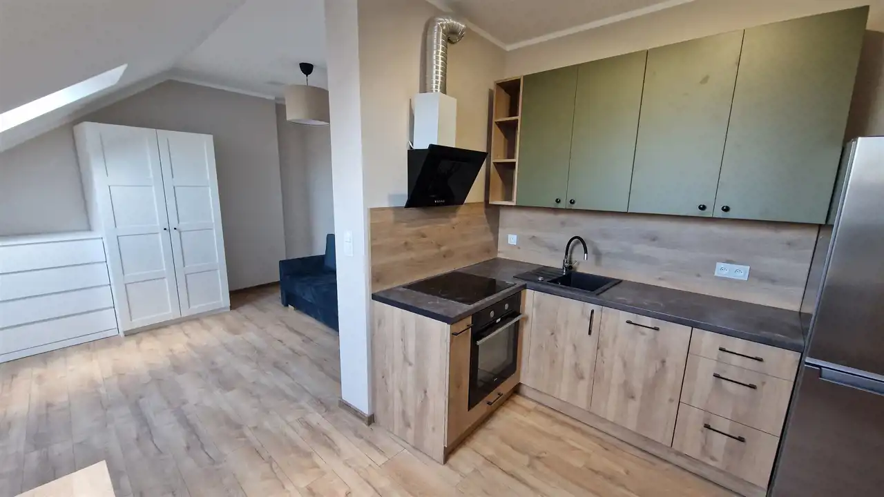 Mieszkanie do wynajęcia znajduje się na 2 piętrze (poddasze) i wyposażone jest w klimatyzację. Powierzchnia wynosi ok. 32 m2 mierzona po podłodze, natomiast użytkowa to ok 23 m2, na którą składa się pokój z aneksem kuchennym z wydzieloną częścią sypialnianą oraz łazienka. Mieszkanie nadaje się dla pary lub singla.