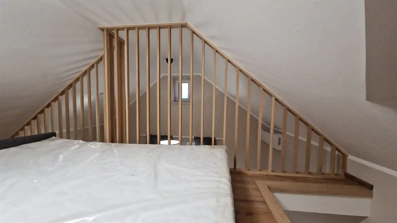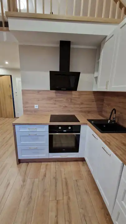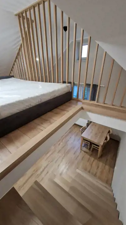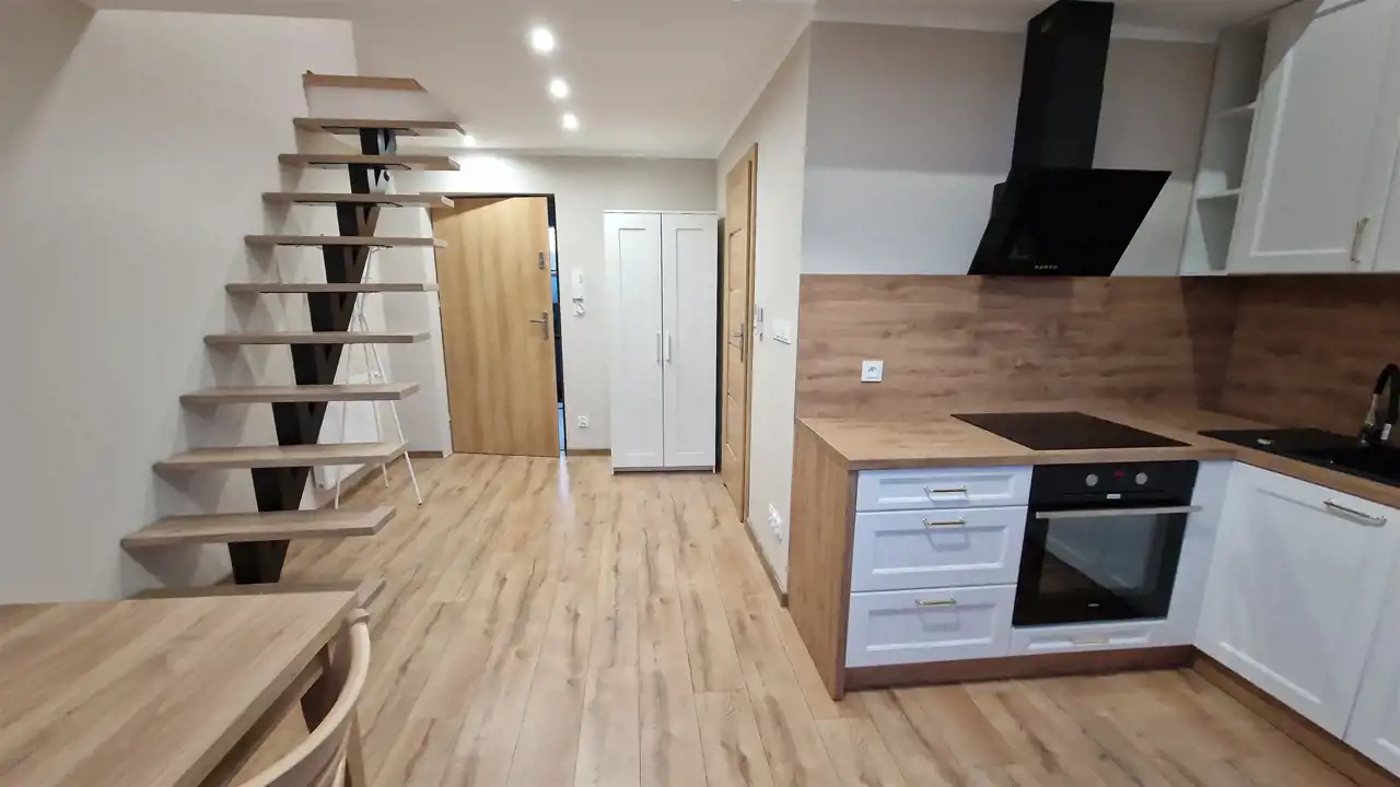 Kawalerka ma bardzo atrakcyjny układ, na poziomie "0" znajduje się łazienka oraz pokój z aneksem kuchennym, natomiast wysokość adaptowanej przestrzeni pozwoliła na wykonanie antresoli, na której znajduje się sypialnia. Całość wykończona jest z wysokiej klasy elementów (kuchnia na wymiar, schody, lamele) i wyposażona w