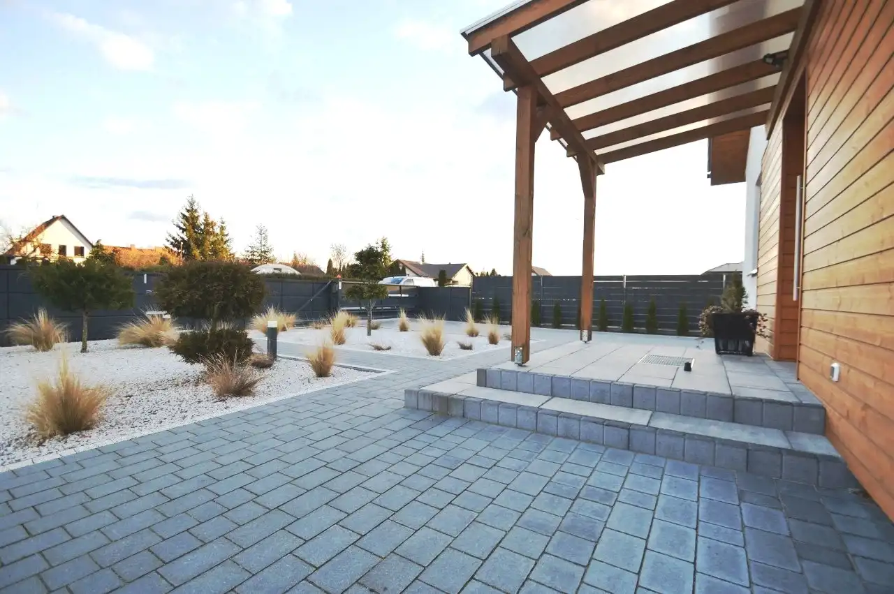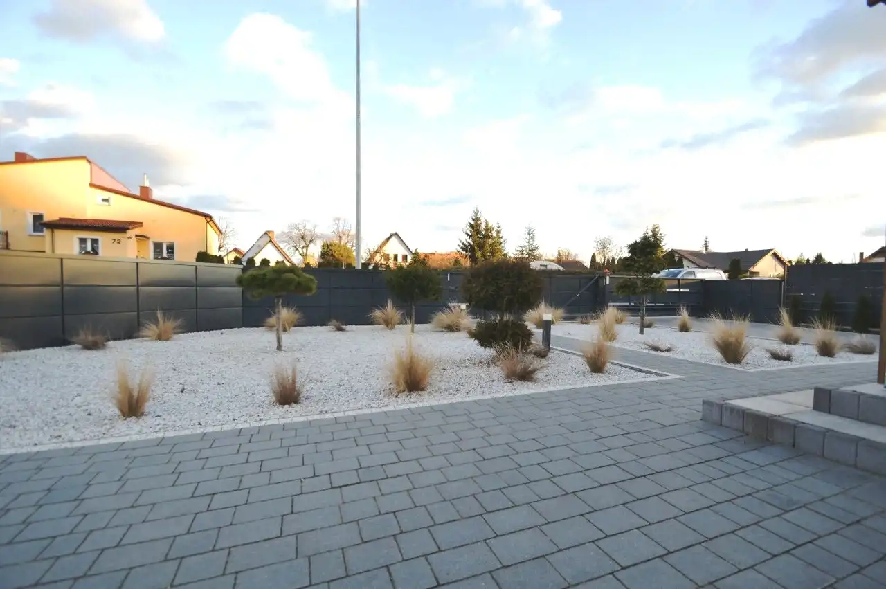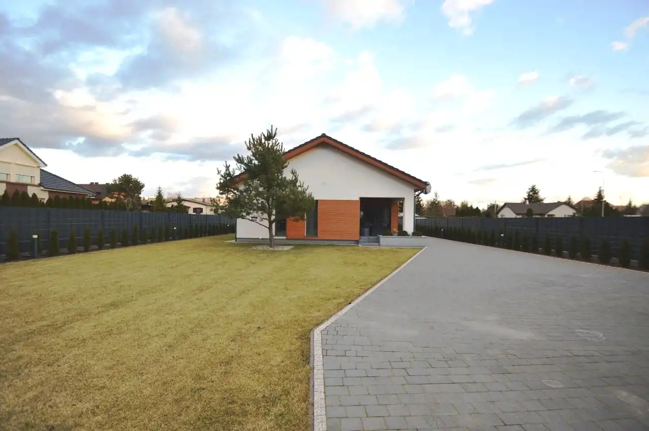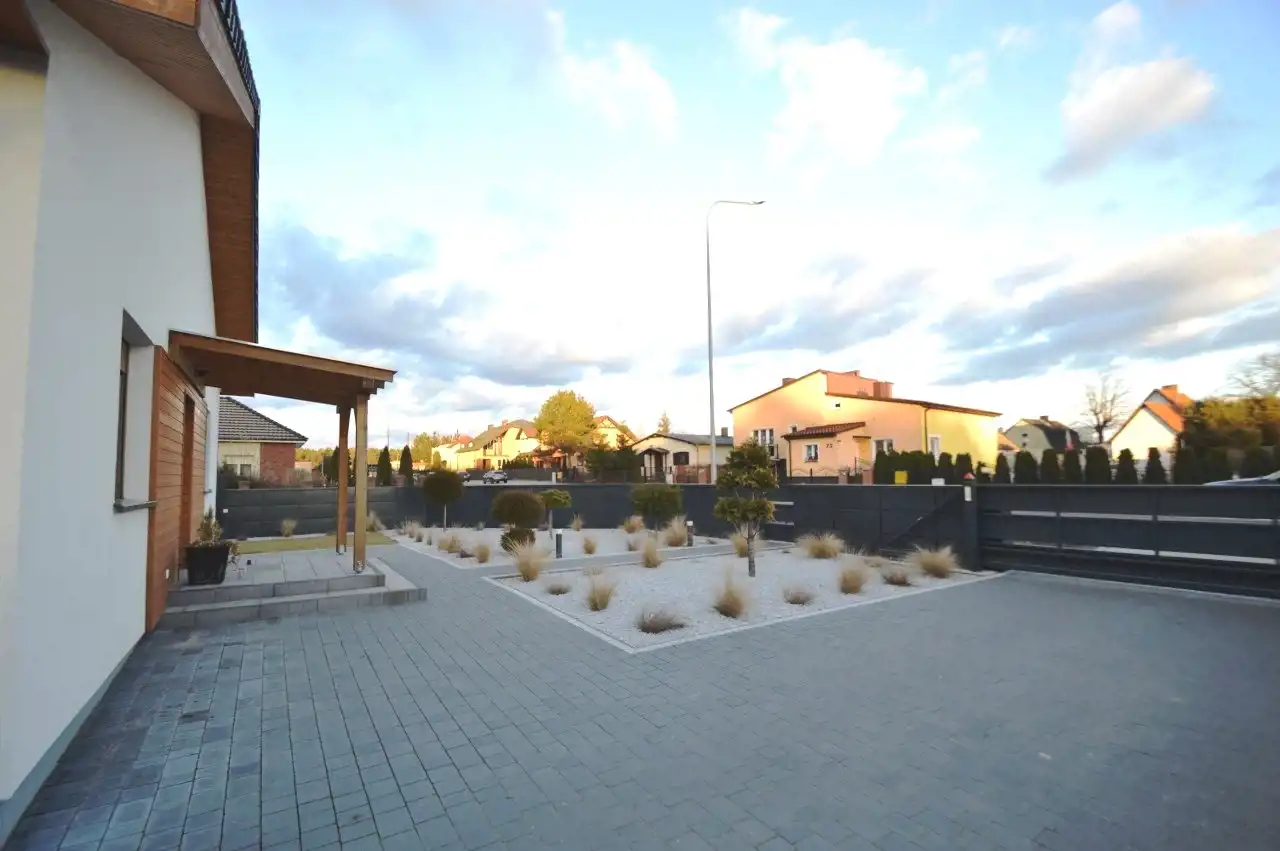 Na działce liczne nasadzenia, oświetlenie ogrodowe, utwardzone ciągi komunikacyjne kostką brukowa, nawadnianie ogrodu z własnego ujęcia