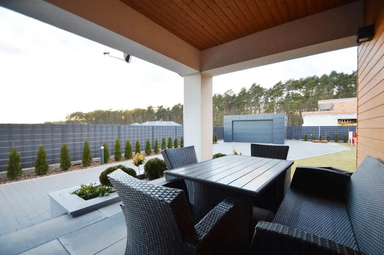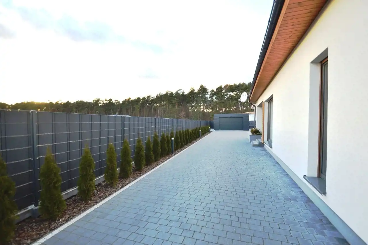Cała posesja ogrodzona przęsłami stalowymi, ocynkowanymi, malowanymi proszkowo z taśmami maskującymi