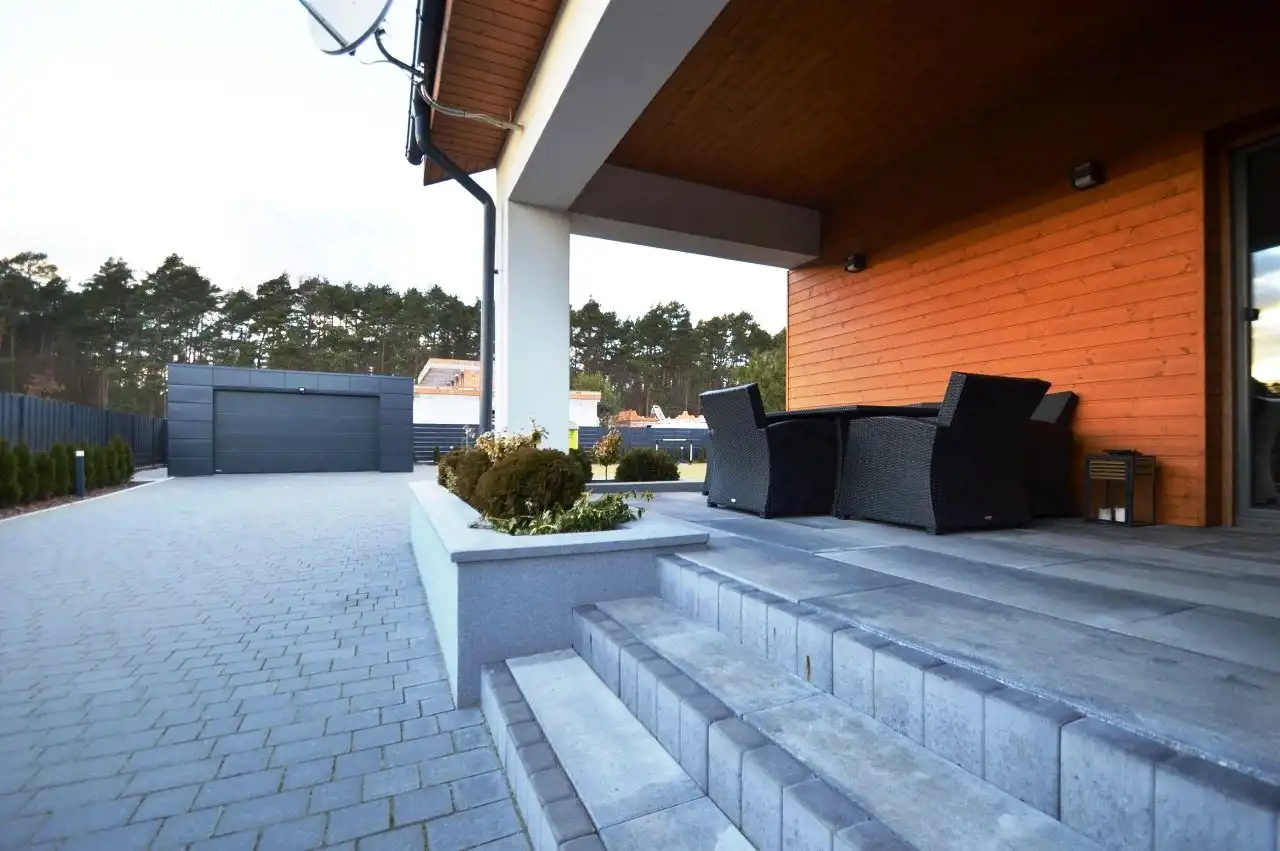 Salon z jadalnią o pow. 30,94m2 - na podłodze panele. duże witryny od strony zachodnio-północnej, wyjście na zadaszony taras, wyłożony kostką brukową