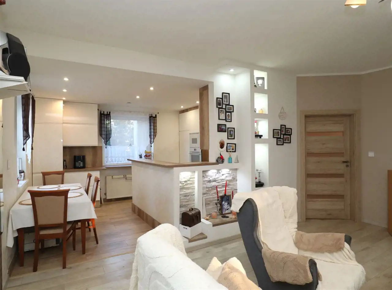 - przestronny salon (27,3 m²) z opcją przywrócenia kominka z płaszczem wodnym oraz z wyjściem na piękny taras o pow. 21m2,