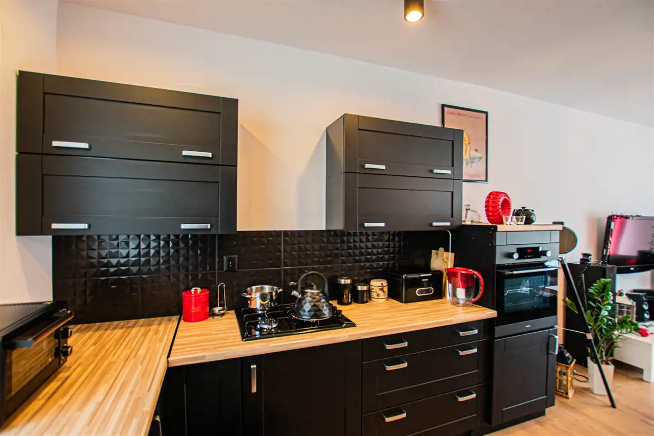 Kuchnia z zabudową kuchenną wyposażona w sprzęt AGD.