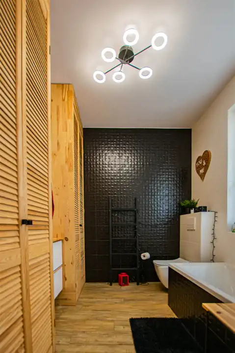 Instalacja grzewcza: ogrzewanie sufitowe - folia grzewcza, w łazience ogrzewanie podłogowe - folia grzewcza.