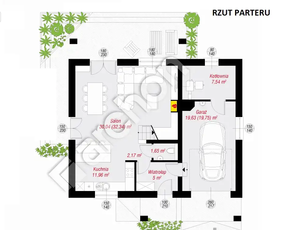 - salon z aneksem kuchennym- o łącznej pow. 34,69m2, przygotowany do montażu kominka z nawiewem (od spodu),