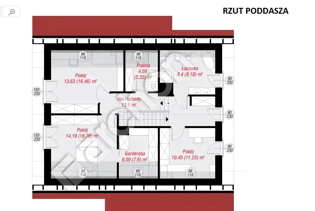 - 3 pokoje- pow. 9,56m2, 11,53m2 i 12,21m2 z własną garderobą o pow. 4,68m2