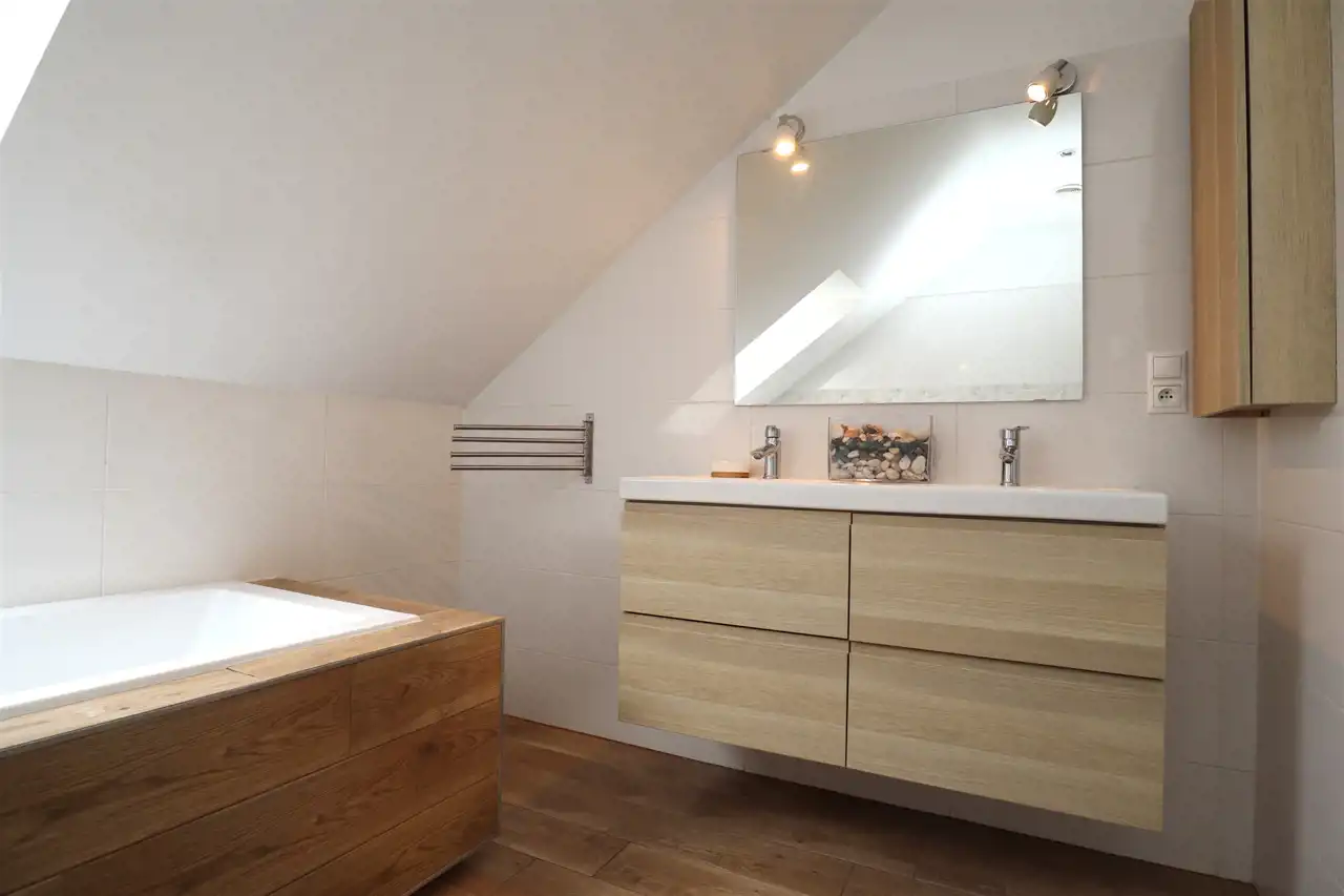 Budynek wybudowany w 2011r. z suporexu, ocieplony styropianem 15 cm. Dach kryty dachówką betonową. Okna drewniane+ rolety zewnętrzne. Ogrzewanie podłogowe: salon, WC, łazienka na parterze oraz kuchnia i łazienka na poddaszu - kominek w salonie (bez płaszcza wodnego).