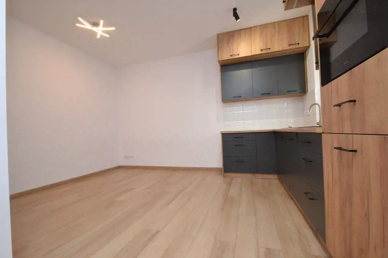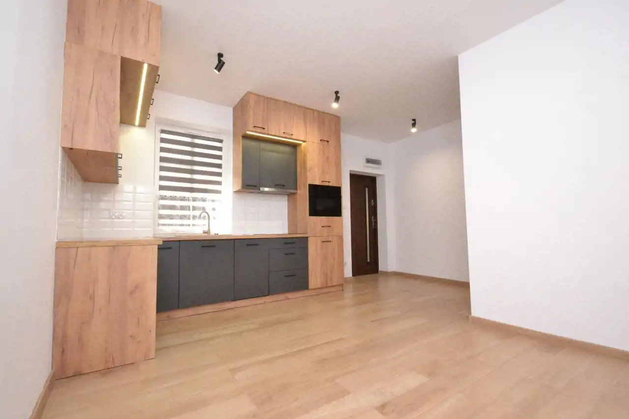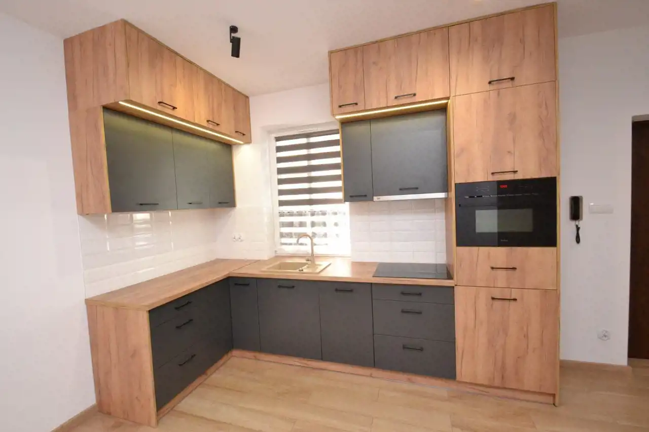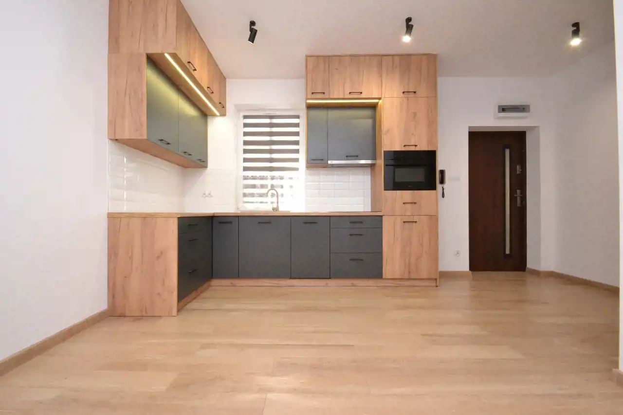 Salon z aneksem kuchennym o pow. 14m2 - meble kuchenne z oświetleniem led, zmywarka, płyta indukcyjna, pochłaniacz zapachów, lodówka, piekarnik