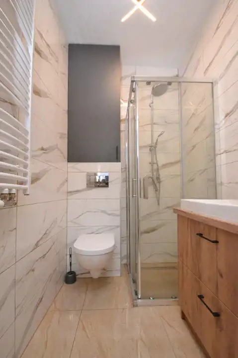 Łazienka z WC o pow. 2,5m2 kabina pysznicowa, toaleta, szafka z umywalka, lustro z oświetleniem, szafa w zabudowie nad toaletą