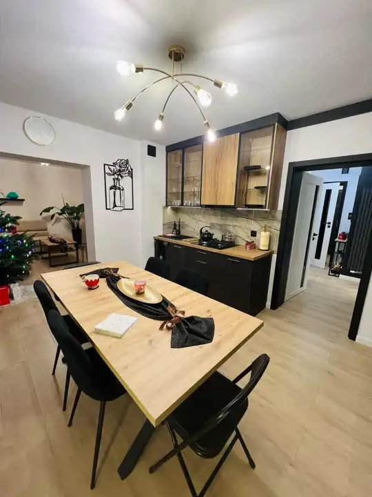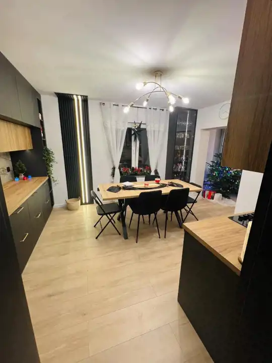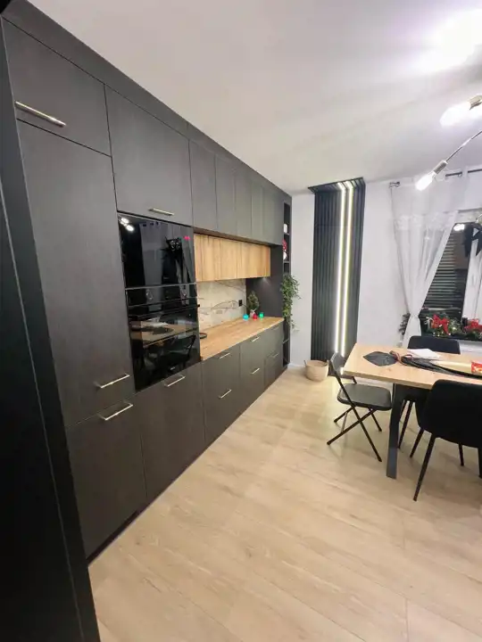Kuchni - meble kuchenne, stół, krzesła, zmywarka, płyta gazowa, piekarnik w zabudowie, mikrofalówka w zabudowie, lodówko-zamrażarka, oświetlenie ledowe, zastawa kuchenna: talerze, garnki, sztudźce itp
