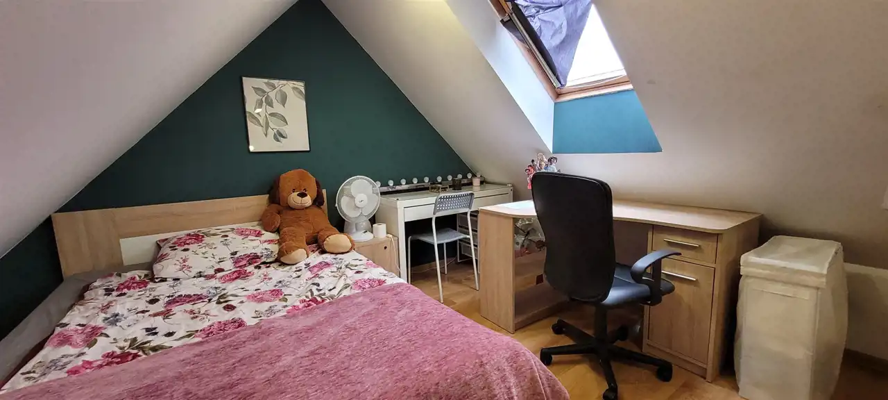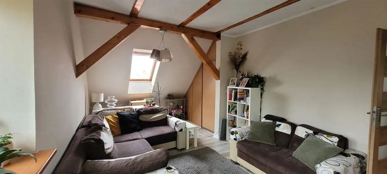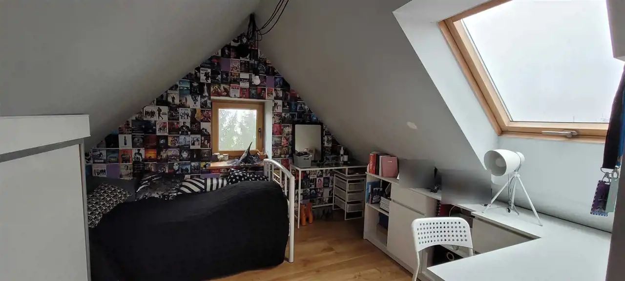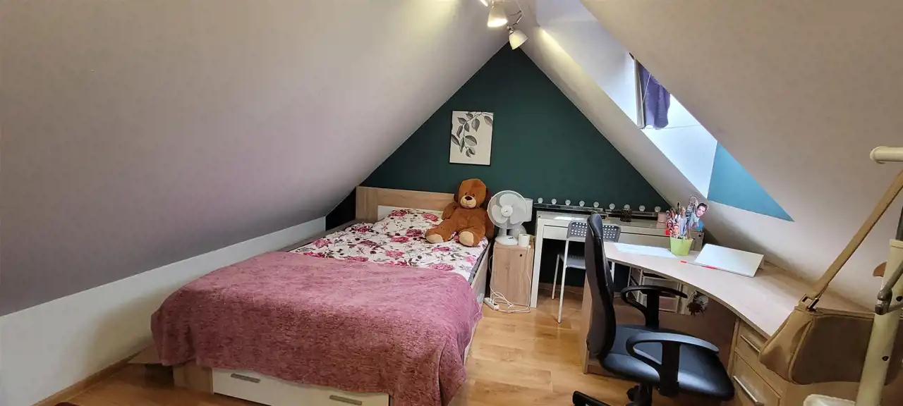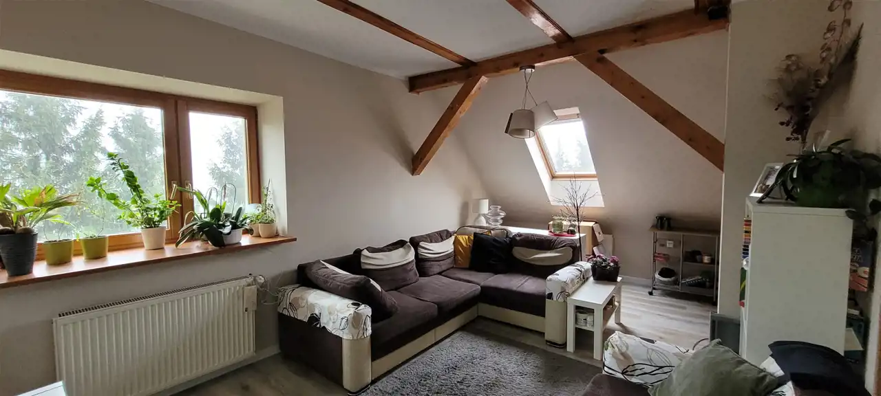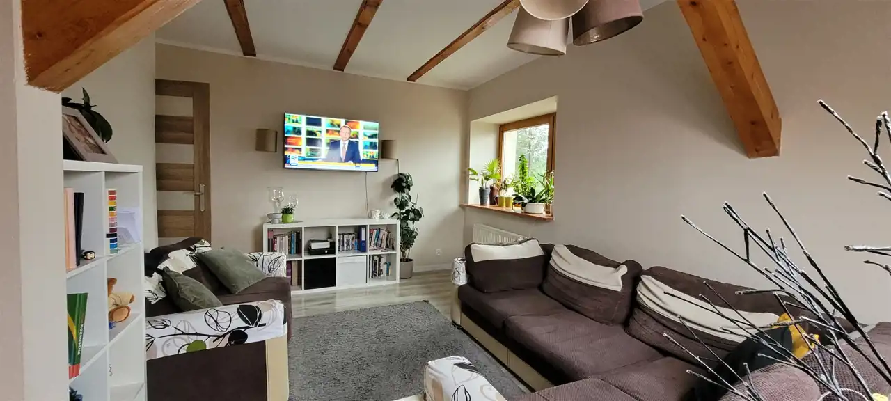 Dach docieplony wełną mineralną. Pomieszczenia przestronne i słoneczne.
