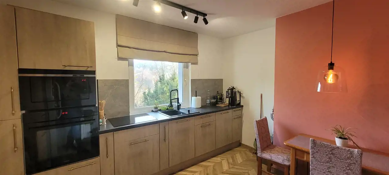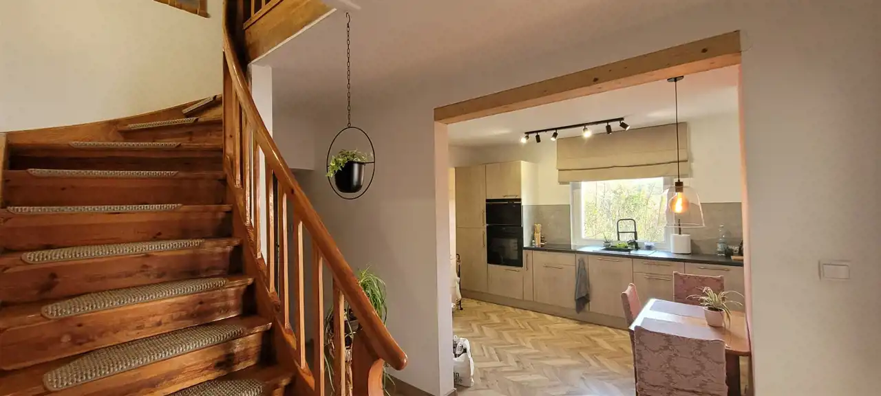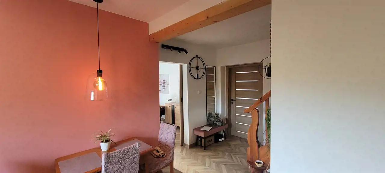 Remont obejmował częściowy drenaż budynku, wymianę poszycia dachowego na blachodachówkę, docieplenie styropianem, we wszystkich pomieszczeniach na ścianach gładź gipsowa, na podłogach panele podłogowe, płytki ceramiczne. Instalacja elektryczna oraz wodno-kanalizacyjna wymieniona. Kondygnacje łączą odrestaurowane drewniane schody.