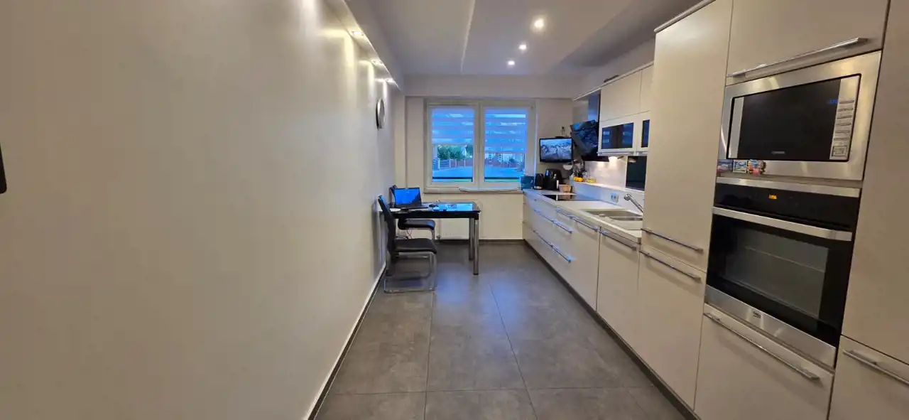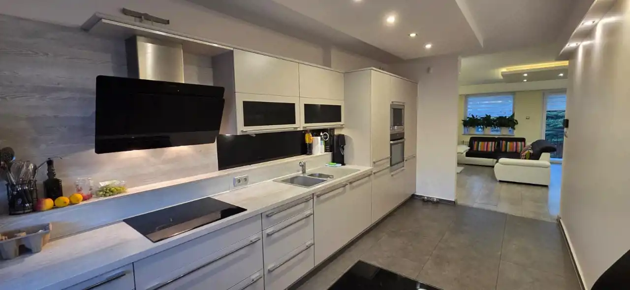 kuchnia po remoncie (meble Nobilla, sprzęt AGD: zmywarka, piekarnik, mikrofalówka, płyta indukcyjna)