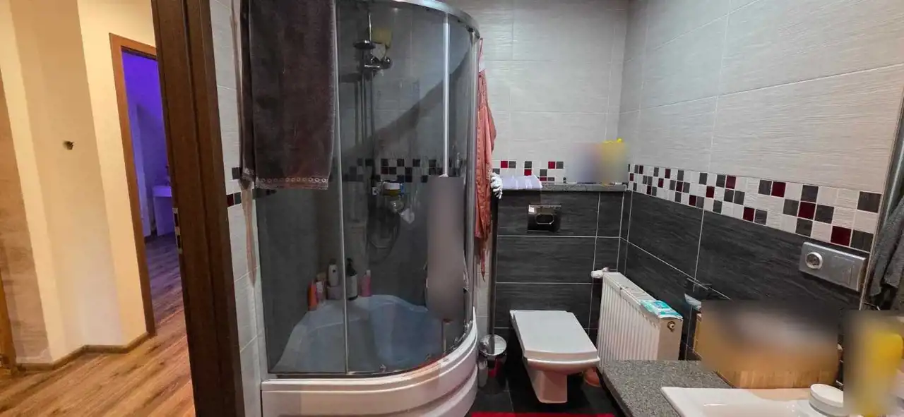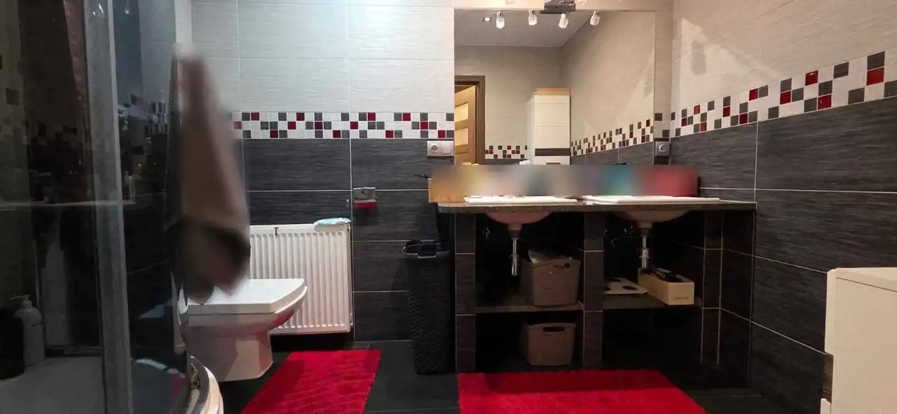 nowoczesna łazienka z dwiema umywalkami, kabiną prysznicową i WC