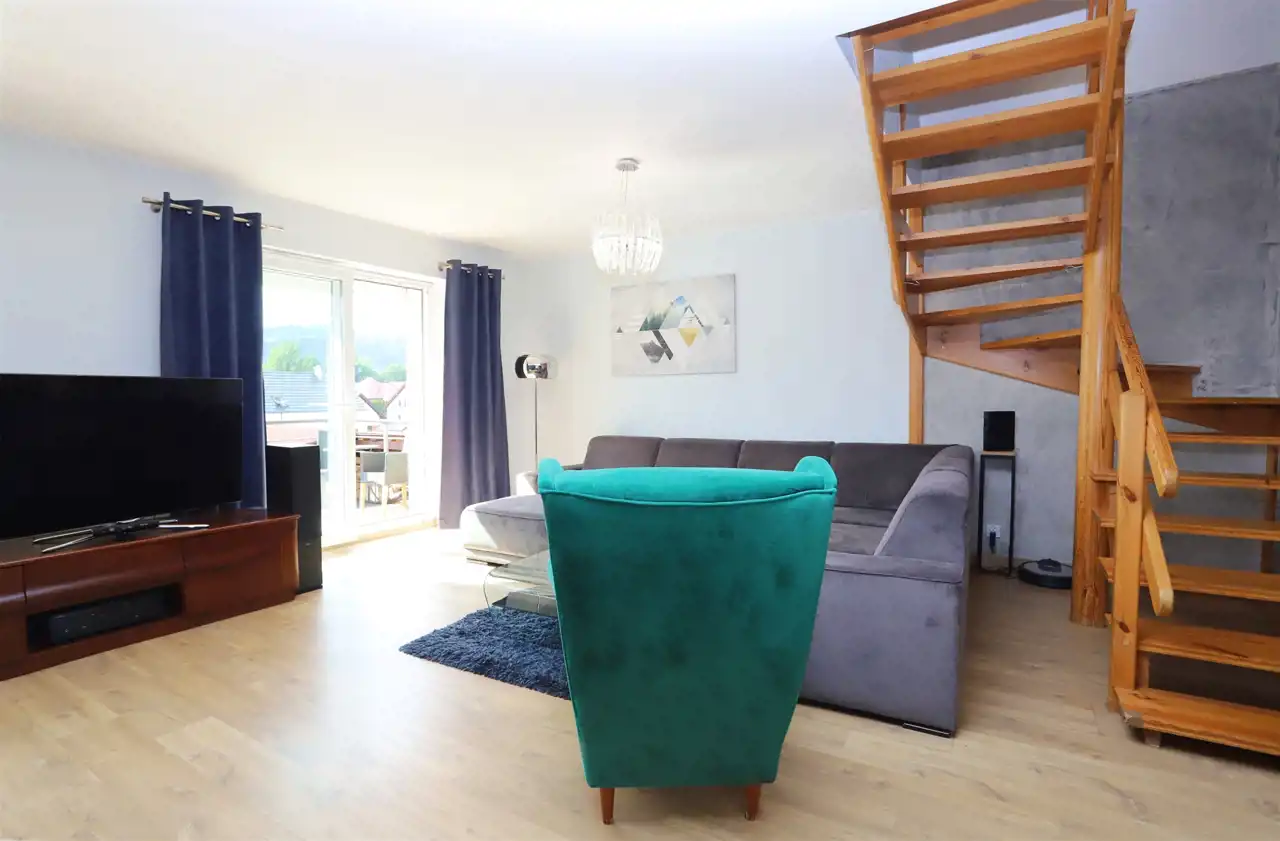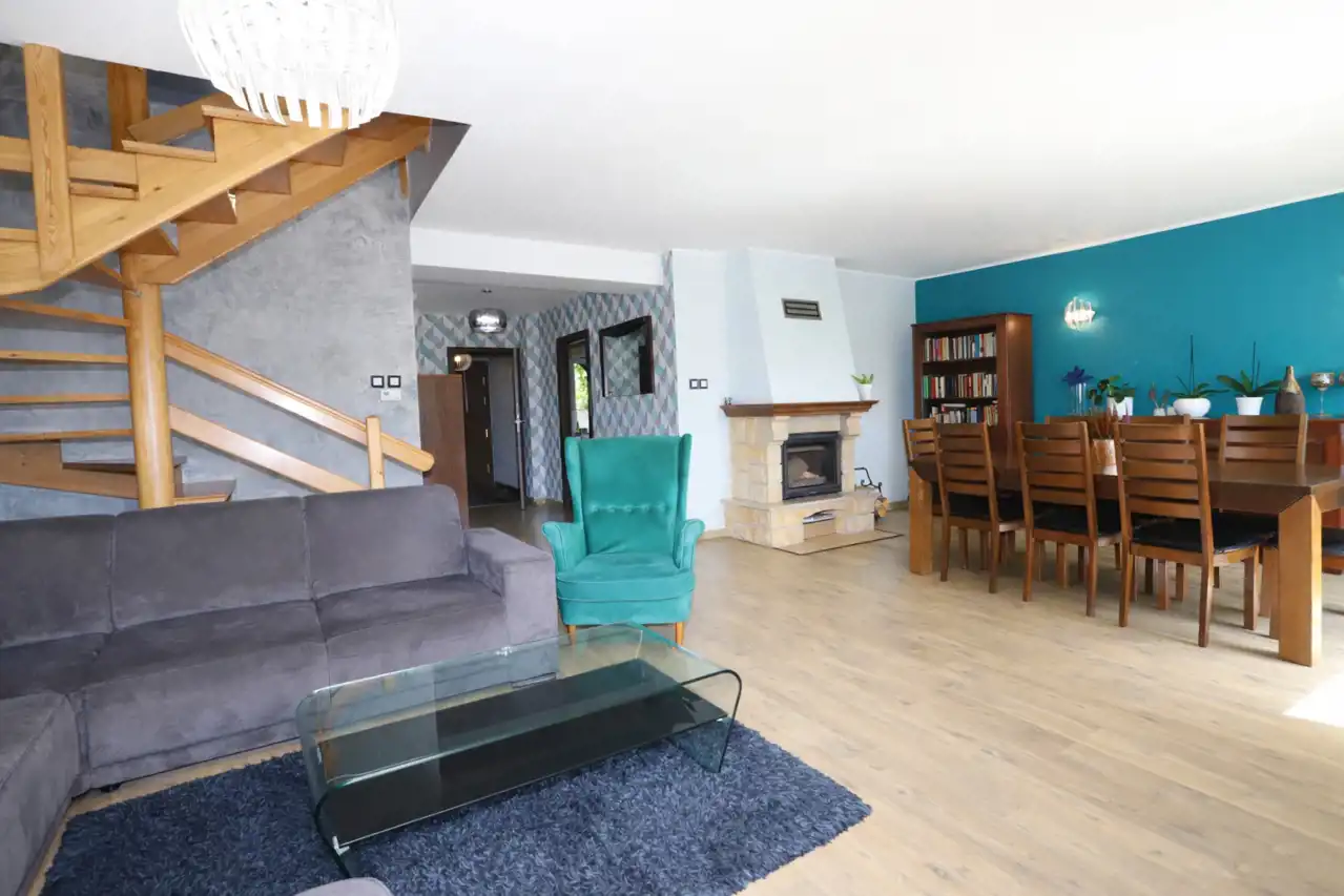 - duży salon z częścią wypoczynkową i jadalnianą oraz wyjściem na taras,