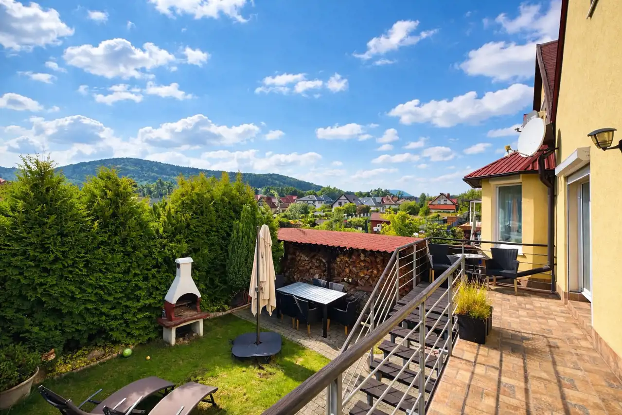 Posesja jest całkowicie ogrodzona, z przodu znajdziemy przestrzeń zieloną oraz miejsca parkingowe. Z tyłu zaś taras oraz miejsce do rekreacji. Niewątpliwym atutem domu są rozpościerające się widoki na pobliskie pasma górskie. A bliskość do parku Rusinowa to niewątpliwy atut tego miejsca. W sąsiedztwie oprócz licznych terenów rekreacyjnych znajdziemy również ważne elementy miejskiej infrastruktury, takie jak dyskont spożywczy, stacja benzynowa, centrum ogrodnicze przy przystanki komunikacji miejskiej i podmiejskiej.