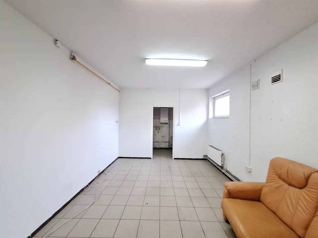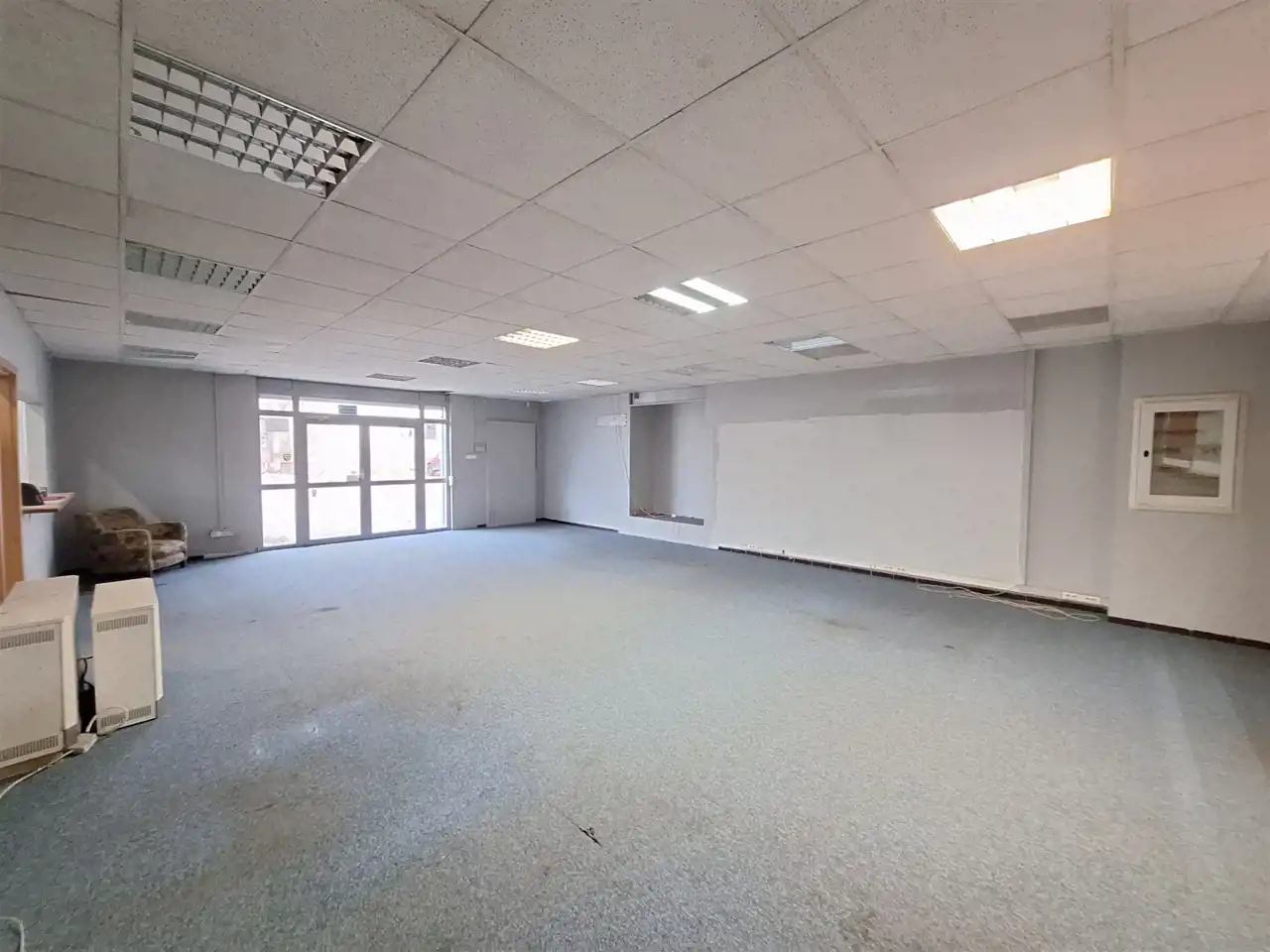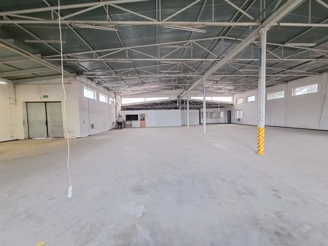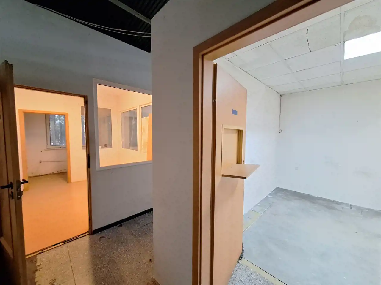Budynek parterowy : duża hala ok 28x28m ( z piecem na olej), sala sprzedaży witryną i roletą ( można podłączyć 2 piece akumulacyjne) 3 pomieszczenia biurowe z oknami, kuchnia, łazienka z wc i prysznicami i pomieszczenie socjalne, możliwe ogrzewanie gazowe