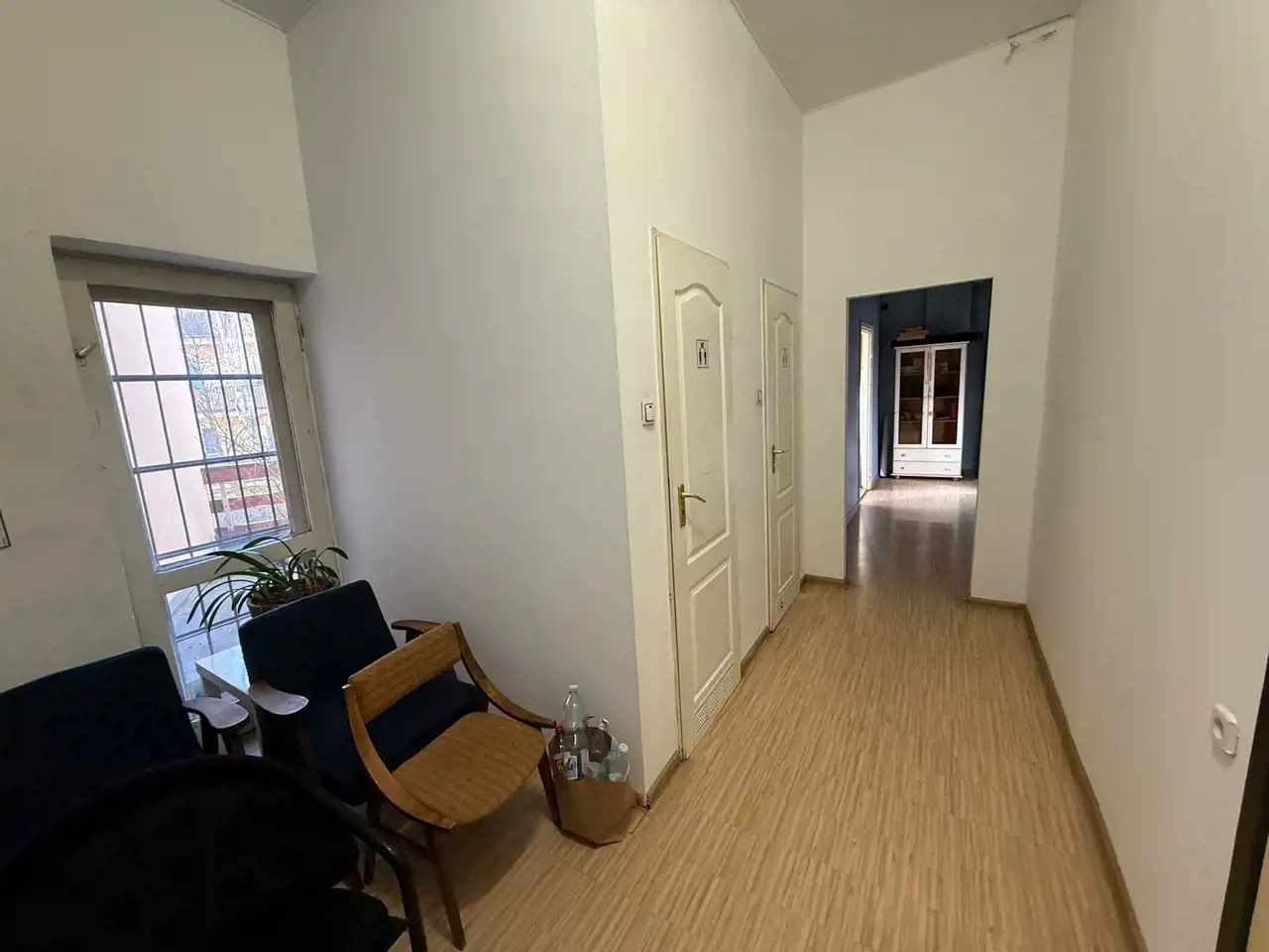 Piętro: 3 pomieszczenia biurowe + kuchnia, dwie toalety, wyjście na balkon, całość 88m2