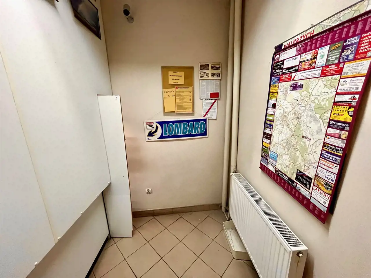 Pomieszczenie sprzedażowe przedzielone jest ścianką ze szklaną witryną i okienkiem. Lokal stanowi idealną propozycję na lombard, usługi ubezpieczeniowe, komunikacyjne, agencję opłat i inne .