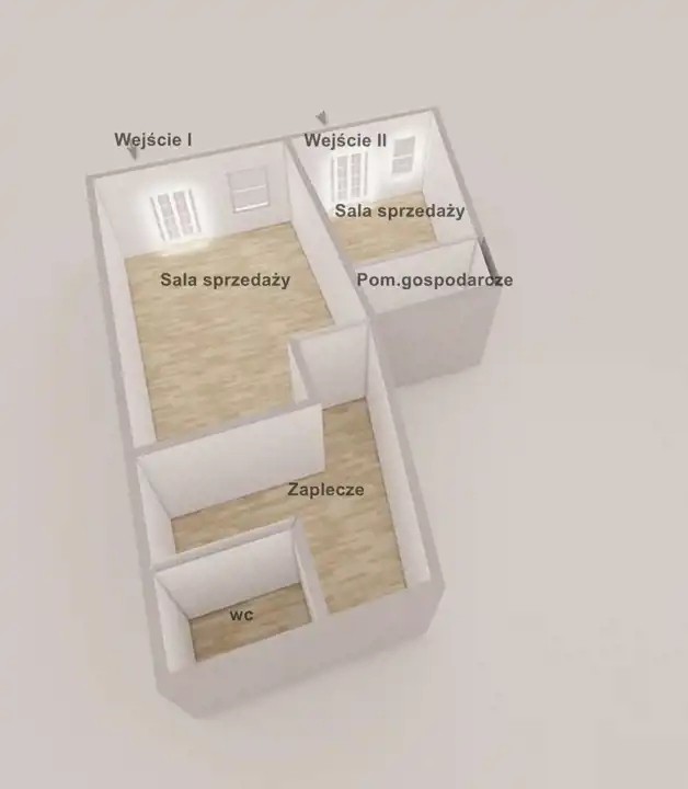 Lokal składa się z dwóch sali sprzedaży, zaplecza, pomieszczenia gospodarczego oraz wc.