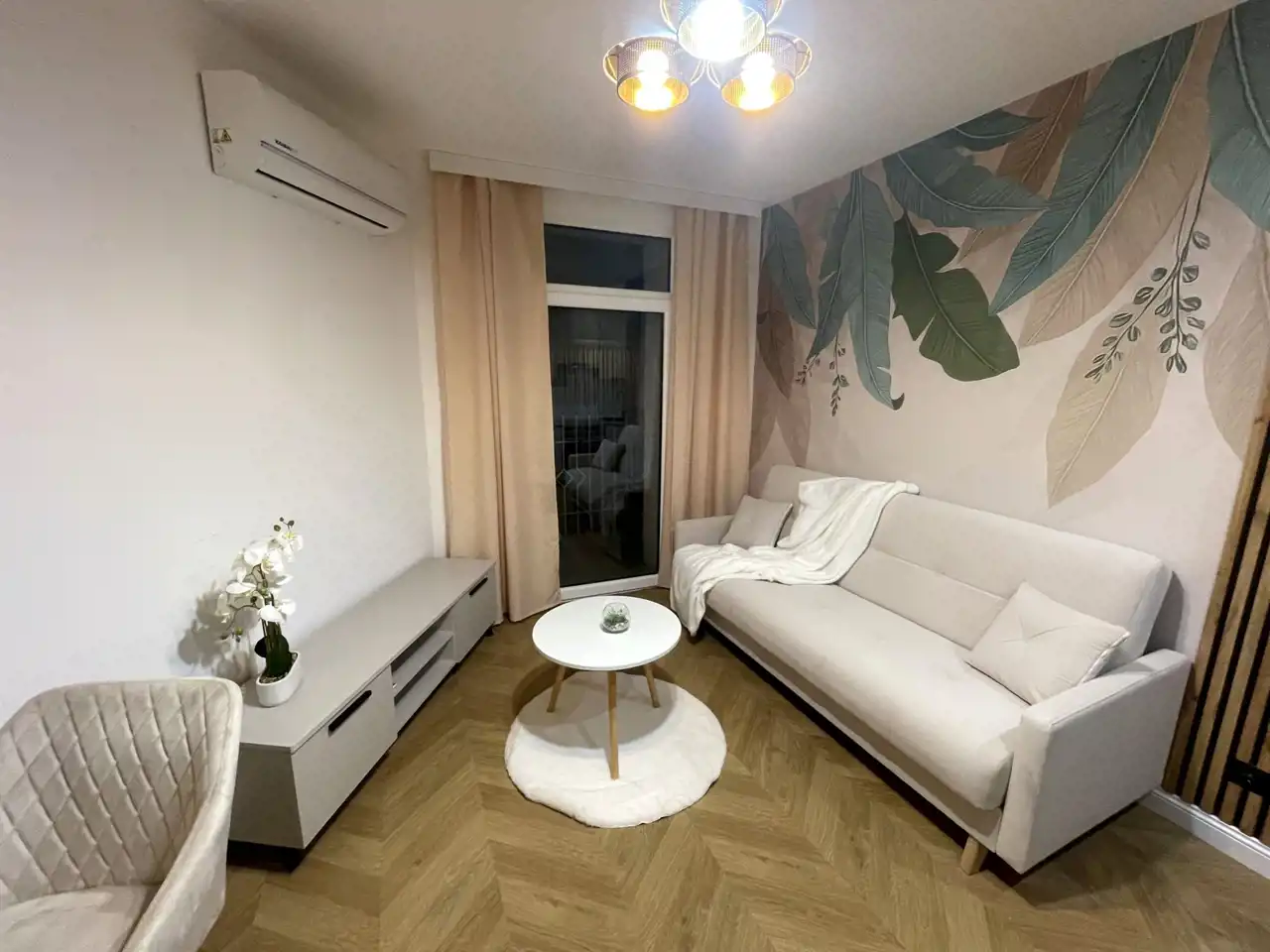 Na podłodze położono panele w jodełkę, które dodają wnętrzu elegancji i lekkości.