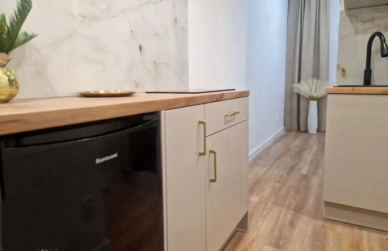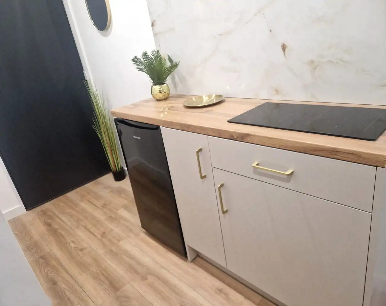 Wyposażona i funkcjonalna kuchnia - wykonana na zamówienie z pewnością zaspokoi oczekiwania ( najmodniejszy kaszmirowy kolor + złote wstawki , zlewozmywak, markowa płyta indukcyjna, piekarnik, lodówka i zmywarka)
