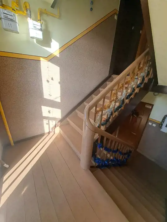 Kamienica z nową elewacją i dachem, klatka schodowa również po remoncie z nową instalacją elektryczną i gazową, zabezpieczona domofonem.