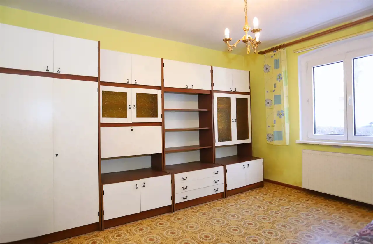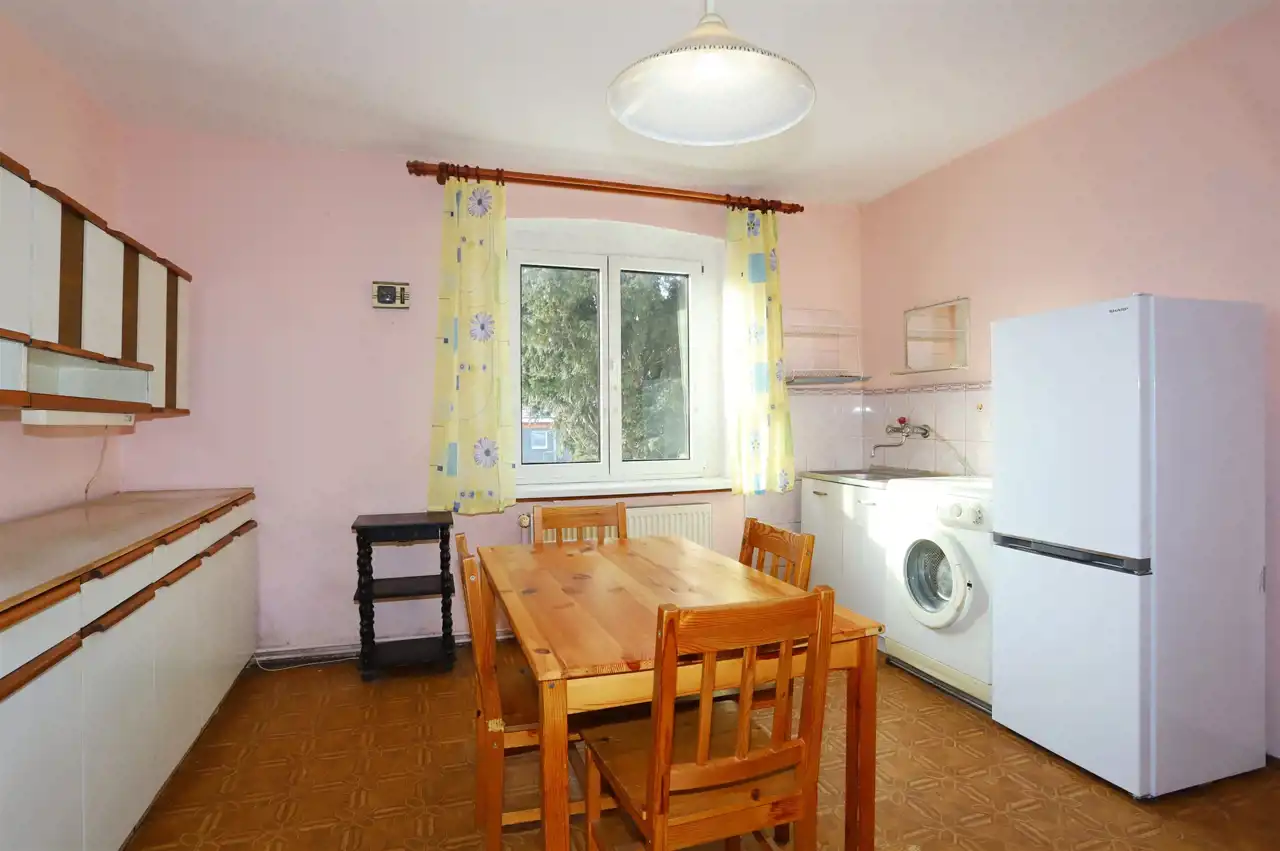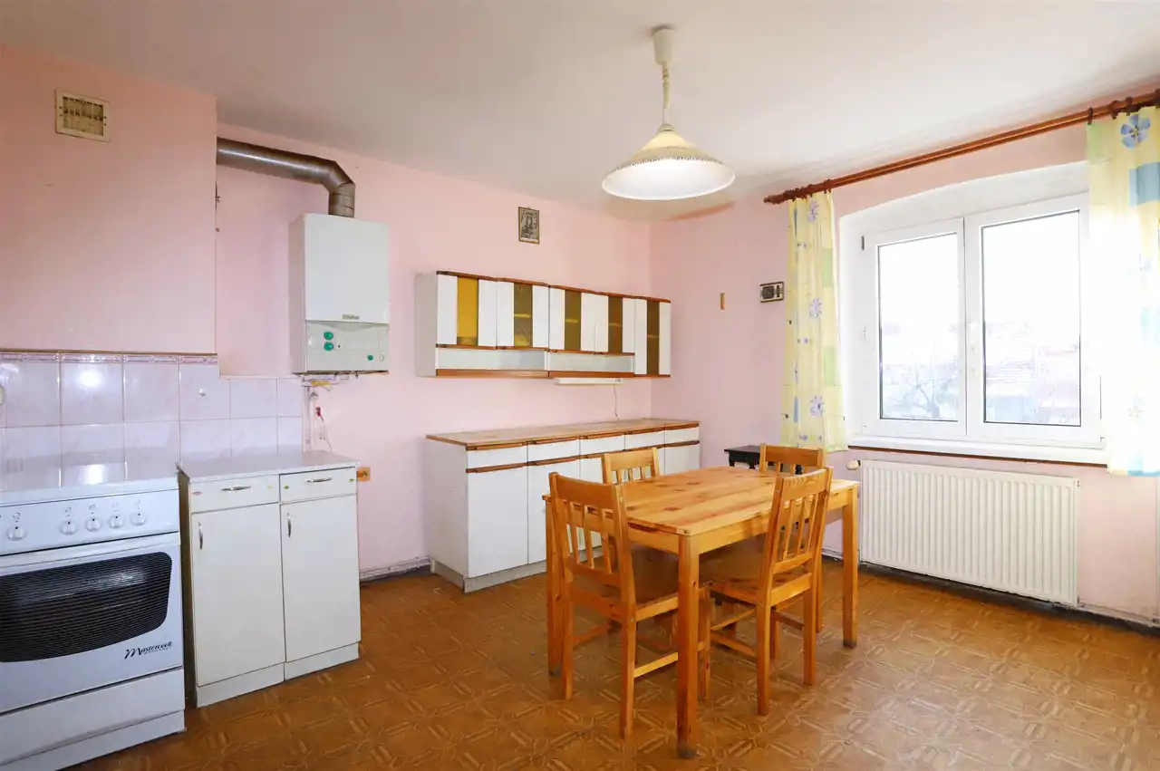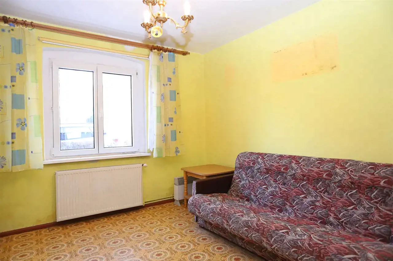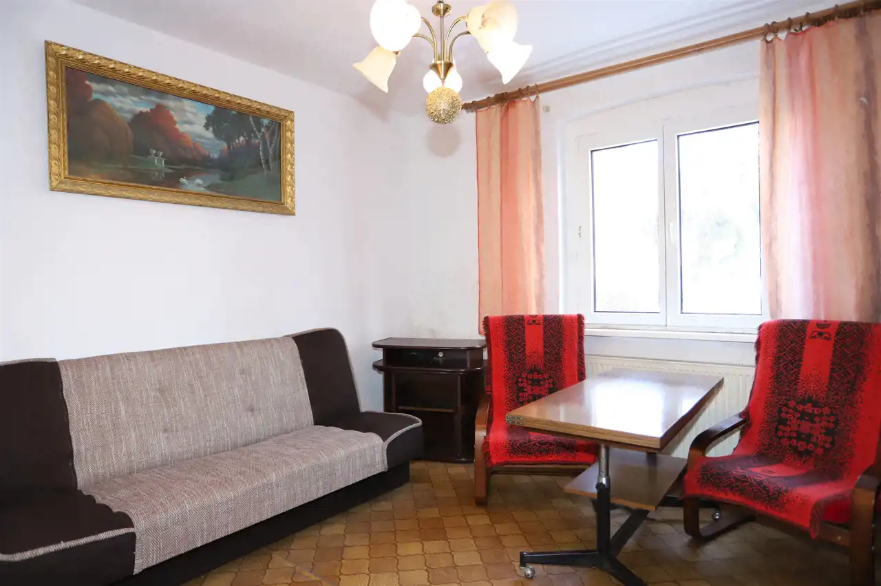 Lokal o powierzchni użytkowej 49,98 m² obejmuje przestronny salon, oddzielną i dużą kuchnię z oknem, przytulną sypialnię, łazienkę z toaletą (również z oknem) oraz przedpokój. Do mieszkania przynależą, ujawnione w księdze wieczystej, dwie piwnice o łącznej powierzchni 9,90 m², co daje całkowitą powierzchnię 59,88 m². Ogrzewanie stanowi instalacja centralna gazowa – system funkcjonuje, jednak wymaga modernizacji.