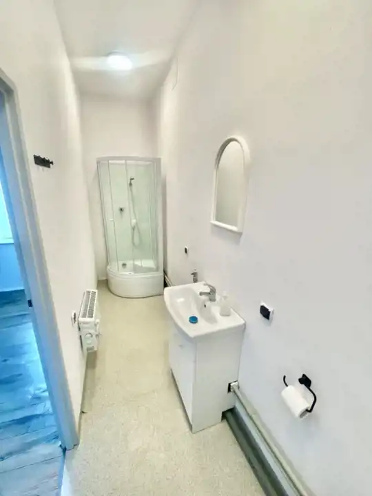 W mieszkaniu znajduje się wc z kabiną prysznicową, dwa pokoje oraz kuchnia z aneksem.