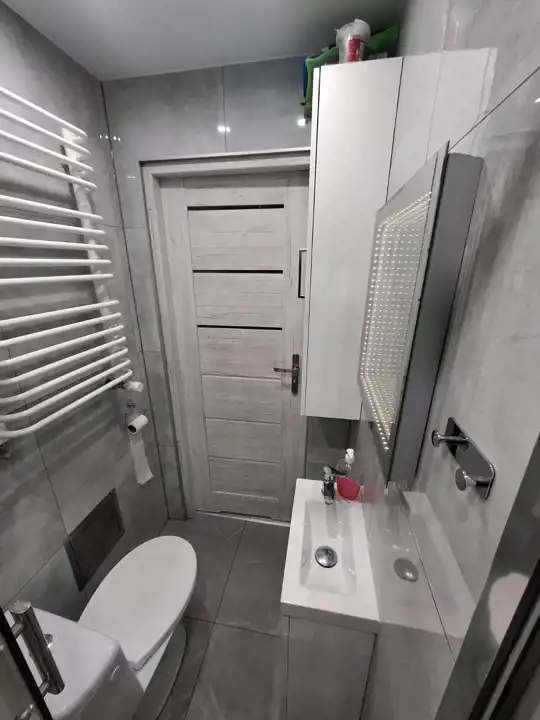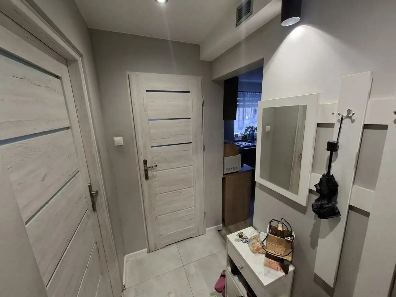 Mieszkanie składa się z pokoju z aneksem kuchennym, sypialni, łazienki z toaletą oraz przedpokoju.