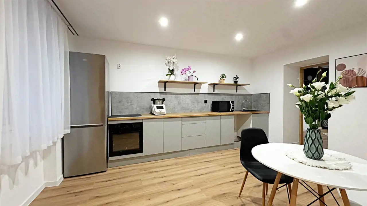 • osobnej, nowoczesnej kuchni z miejscem na stół jadalniany,