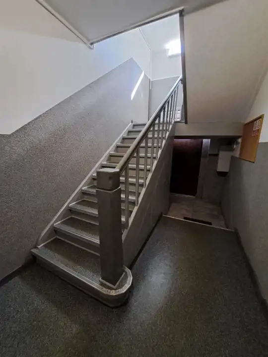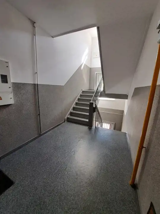 Kamienica po remoncie elewacji z nowym dachem, klatka schodowa również po remoncie zabezpieczona domofonem.