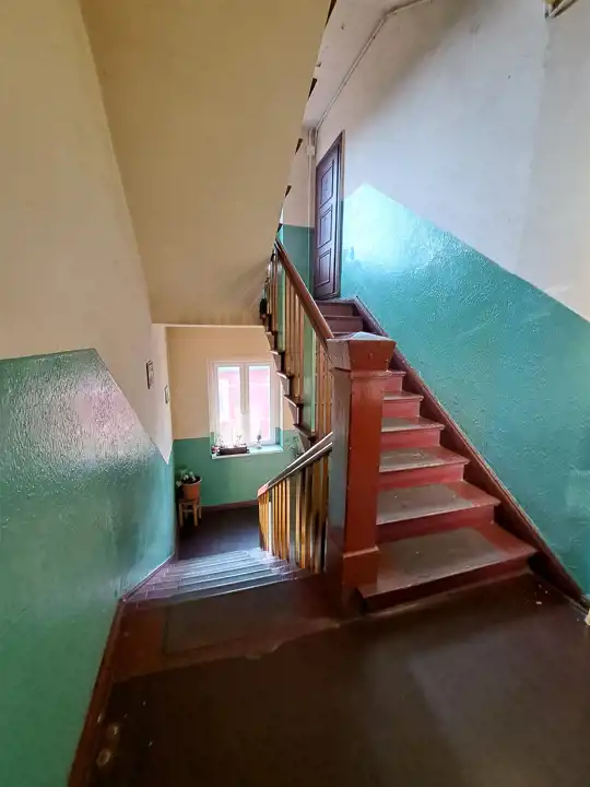 Kamienica po remoncie dachu, docieplonej elewacji od tylnej strony, klatka schodowa zadbana i zabezpieczona domofonem.