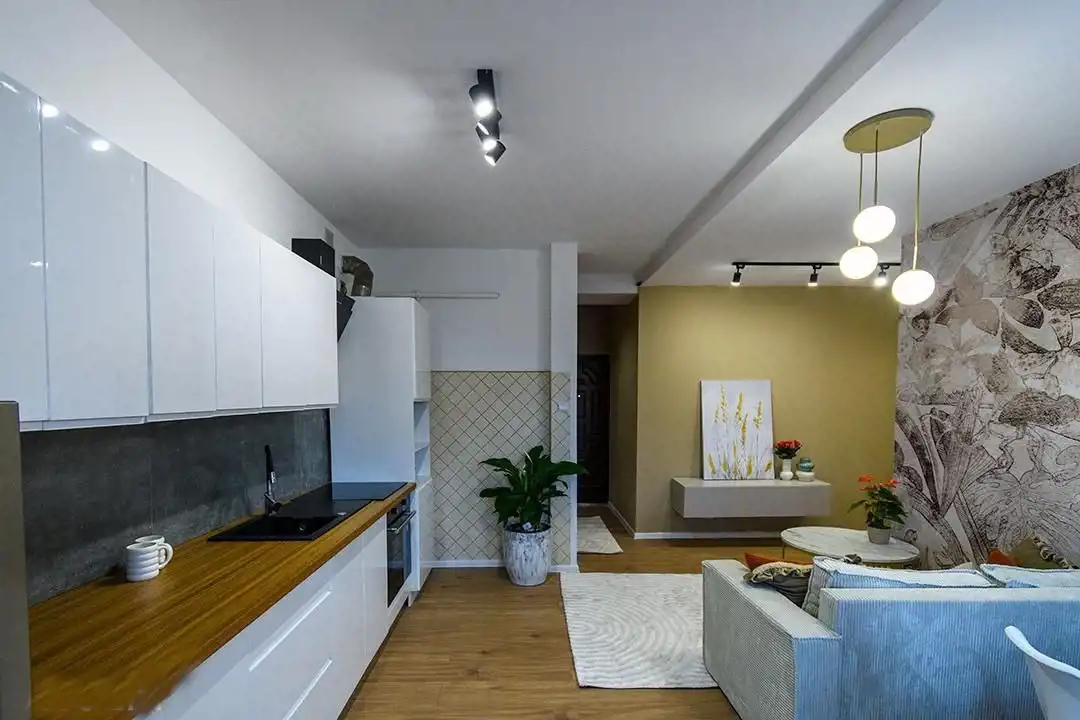 Salon z aneksem kuchennym: wyposażony w meble oraz sprzęt AGD (lodówka, kuchenka, piekarnik).